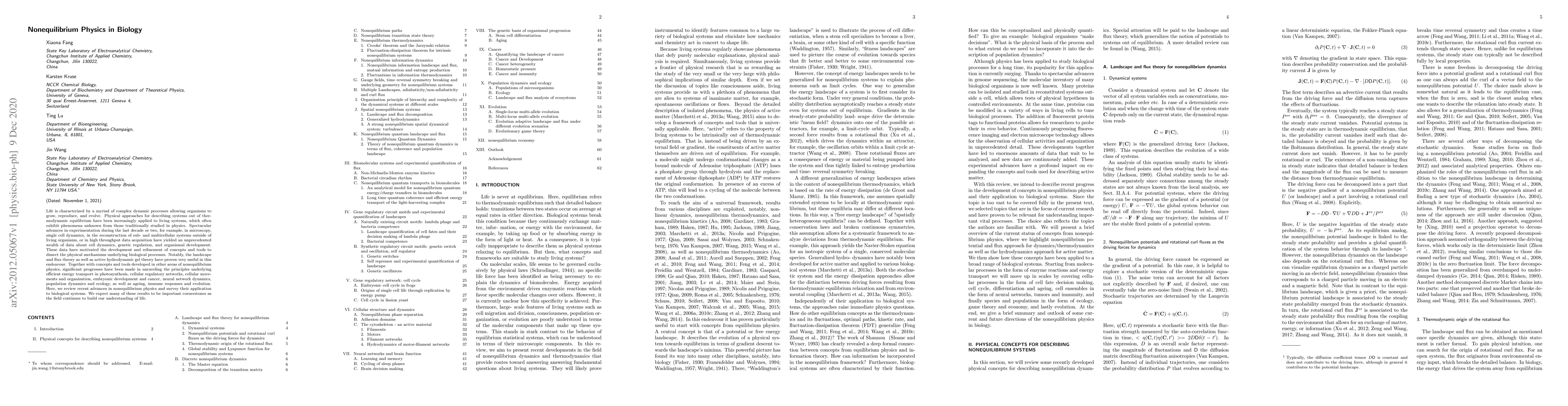 This paper reviews recent advances in nonequilibrium physics applied to biological systems, highlighting the use of concepts like landscape and flux theory and active hydrodynamic gel theory to understand complex dynamic processes in life, including energy transport, cellular regulation, and developmental biology. The paper emphasizes the importance of these physical approaches in advancing our understanding of biological phenomena.
