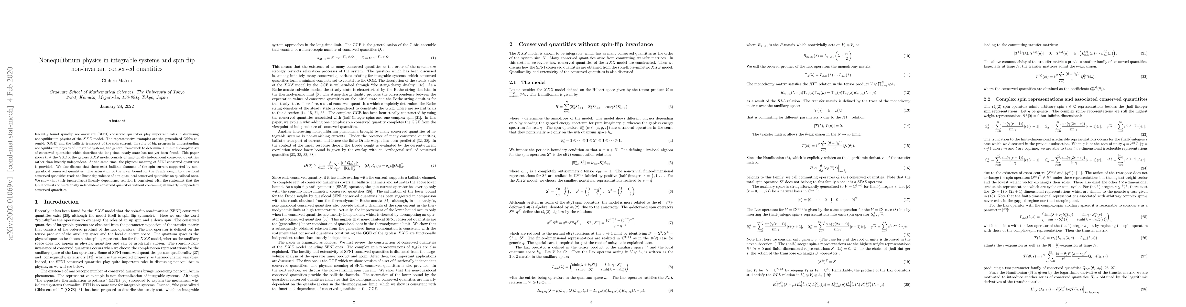 Recently found spin-flip non-invariant (SFNI) conserved quantities play important roles in discussing nonequilibrium physics of the XXZ model. The representative examples are the generalized Gibbs ensemble (GGE) and the ballistic transport of the spin current. In spite of big progress in understanding nonequilibrium physics of integrable systems, the general framework to determine a minimal complete set of conserved quantities which describes the long-time steady state has not yet been found. This paper shows that the GGE of the gapless XXZ model consists of functionally independent conserved quantities rather than linearly independent. At the same time, the physical meaning of SFNI conserved quantities is provided. We also discuss that there exist ballistic channels of the spin current supported by non-quasilocal conserved quantities. The saturation of the lower bound for the Drude weight by quasilocal conserved quantities reads the linear dependence of non-quasilocal conserved quantities on quasilocal ones. We show that their (generalized) linearly dependence relation is consistent with the statement that the GGE consists of functionally independent conserved quantities without containing all linearly independent conserved quantities.