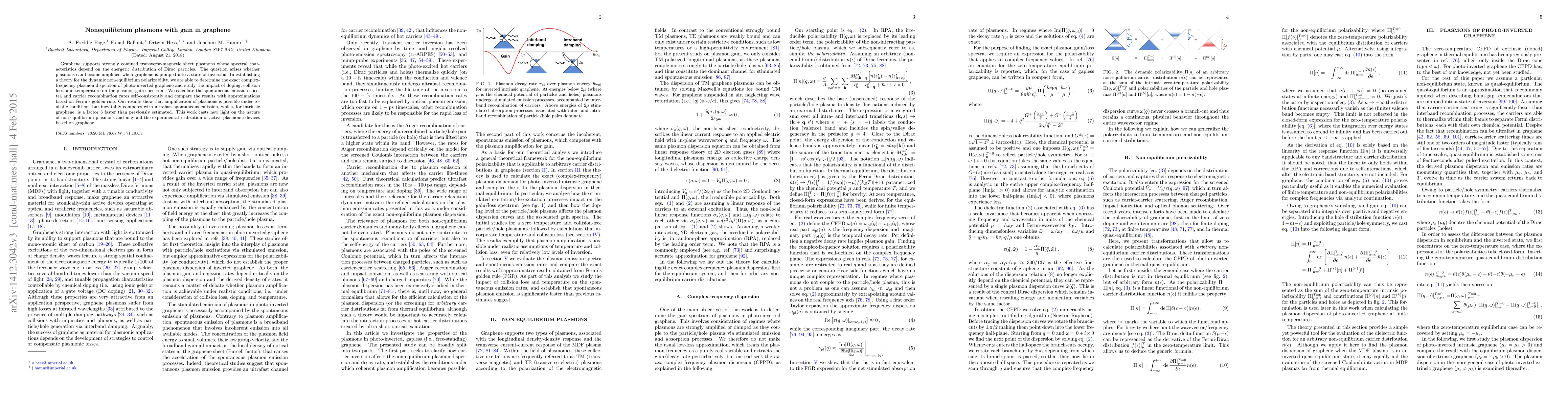 Graphene supports strongly confined transverse-magnetic sheet plasmons whose spectral characteristics depend on the energetic distribution of Dirac particles. The question arises whether plasmons can become amplified when graphene is pumped into a state of inversion. In establishing a theory for the dynamic non-equilibrium polarizability, we are able to determine the exact complex-frequency plasmon dispersion of photo-inverted graphene and study the impact of doping, collision loss, and temperature on the plasmon gain. We calculate the spontaneous emission spectra and carrier recombination rates self-consistently and compare the results with approximations based on Fermi's golden rule. Our results show that amplification of plasmons is possible under realistic conditions but inevitably competes with ultrafast spontaneous emission, which for intrinsic graphene, is a factor 5 faster than previously estimated. This work casts new light on the nature of non-equilibrium plasmons and may aid the experimental realization of active plasmonic devices based on graphene.