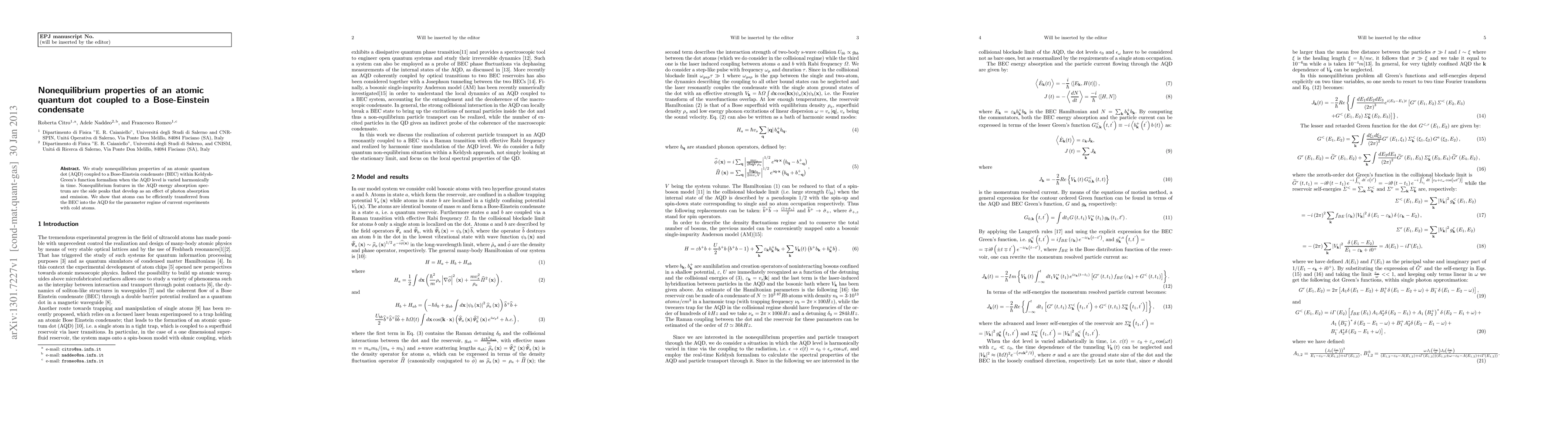 This paper explores nonequilibrium dynamics in an atomic quantum dot coupled to a Bose-Einstein condensate, revealing side peaks in the AQD absorption spectrum due to photon absorption and emission. The study demonstrates efficient atom transfer from the BEC to the AQD under current experimental conditions for cold atoms.