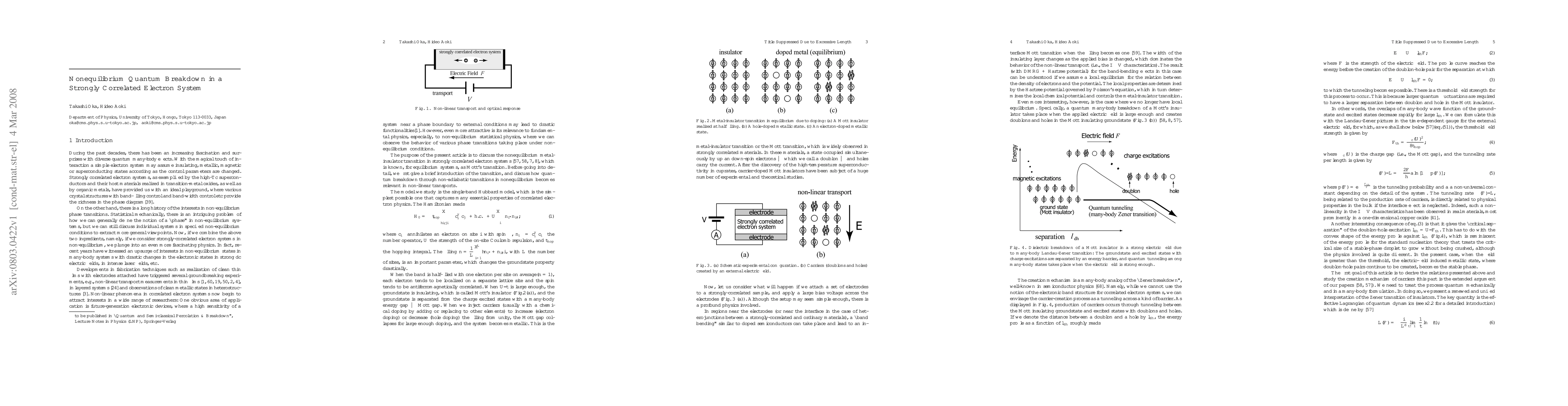 The nonlinear transport properties of the Mott insulator are discussed with focus on the many-body Landau-Zener mechanism. After reviewing basic concepts such as the non-adiabatic geometric phase and the Schwinger mechanism, we study the decay of the insulating groundstate in strong electric fields using the time-dependent density matrix renormalization group. A short comment on the proposed mapping to the quantum walk model is added before discussing the relevance of the theory to experimental results. This article is a draft of a book chapter of the book entitled "Quantum and Semi-classical Percolation & Breakdown" (Lecture Note in Physics, Springer-Verlag), to appear 2008.