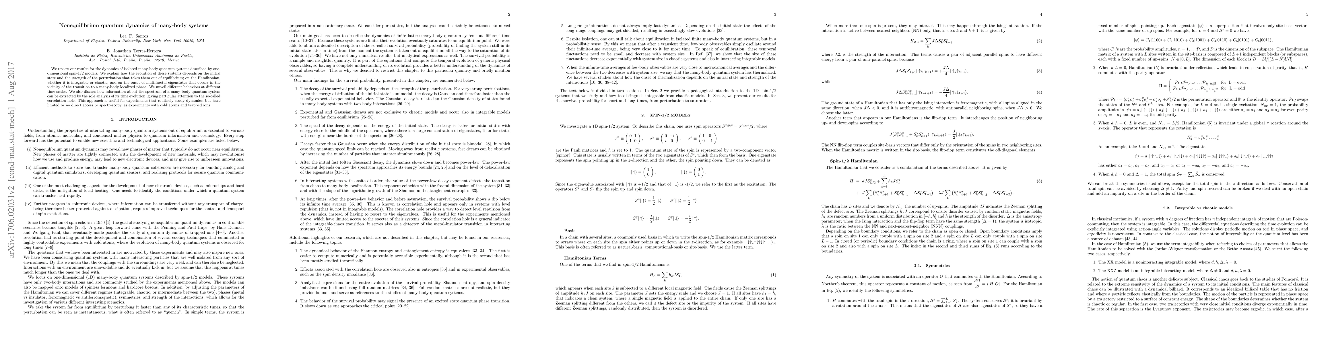 This paper reviews the nonequilibrium dynamics of one-dimensional spin-1/2 quantum systems, highlighting how initial states, perturbations, Hamiltonian types, and multifractal eigenstates influence their evolution. It also explores extracting spectral information from time evolution, particularly through the correlation hole, useful for dynamic experiments with cold atoms and trapped ions.