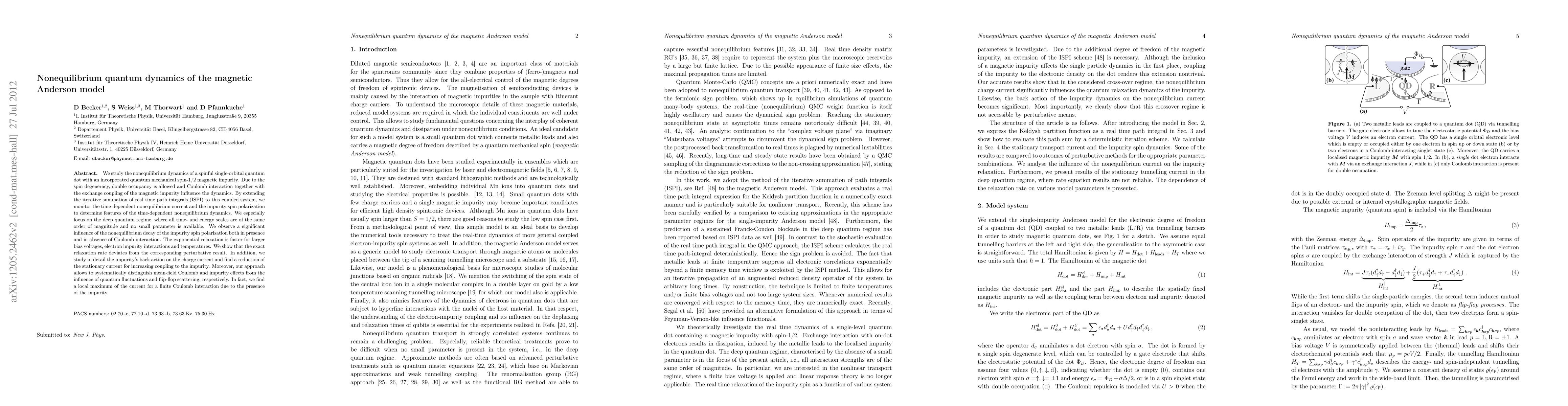 We study the non-equilibrium dynamics of a spinful single-orbital quantum dot with an incorporated quantum mechanical spin-1/2 magnetic impurity. Due to the spin degeneracy, double occupancy is allowed, and Coulomb interaction together with the exchange coupling of the magnetic impurity influence the dynamics. By extending the iterative summation of real-time path integrals (ISPI) to this coupled system, we monitor the time-dependent non-equilibrium current and the impurity spin polarization to determine features of the time-dependent non-equilibrium dynamics. We particulary focus on the deep quantum regime, where all time and energy scales are of the same order of magnitude and no small parameter is available. We observe a significant influence of the non-equilibrium decay of the impurity spin polarization both in the presence and in the absence of Coulomb interaction. The exponential relaxation is faster for larger bias voltages, electron-impurity interactions and temperatures. We show that the exact relaxation rate deviates from the corresponding perturbative result. In addition, we study in detail the impurity's back action on the charge current and find a reduction of the stationary current for increasing coupling to the impurity. Moreover, our approach allows us to systematically distinguish mean-field Coulomb and impurity effects from the influence of quantum fluctuations and flip-flop scattering, respectively. In fact, we find a local maximum of the current for a finite Coulomb interaction due to the presence of the impurity.