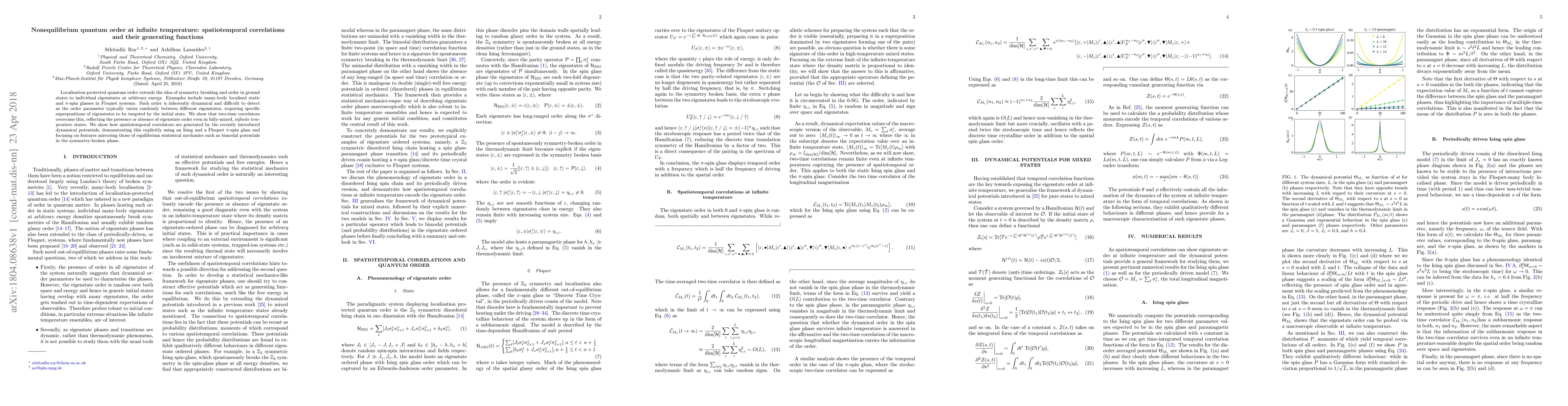 Localisation-protected quantum order extends the idea of symmetry breaking and order in ground states to individual eigenstates at arbitrary energy. Examples include many-body localised static and $\pi$-spin glasses in Floquet systems. Such order is inherently dynamical and difficult to detect as the order parameter typically varies randomly between different eigenstates, requiring specific superpositions of eigenstates to be targeted by the initial state. We show that two-time correlators overcome this, reflecting the presence or absence of eigenstate order even in fully-mixed, $infinite$ $temperature$ states. We show how spatiotemporal correlators are generated by the recently introduced dynamical potentials, demonstrating this explicitly using an Ising and a Floquet $\pi$-spin glass and focusing on features mirroring those of equilibrium statistical mechanics such as bimodal potentials in the symmetry-broken phase.