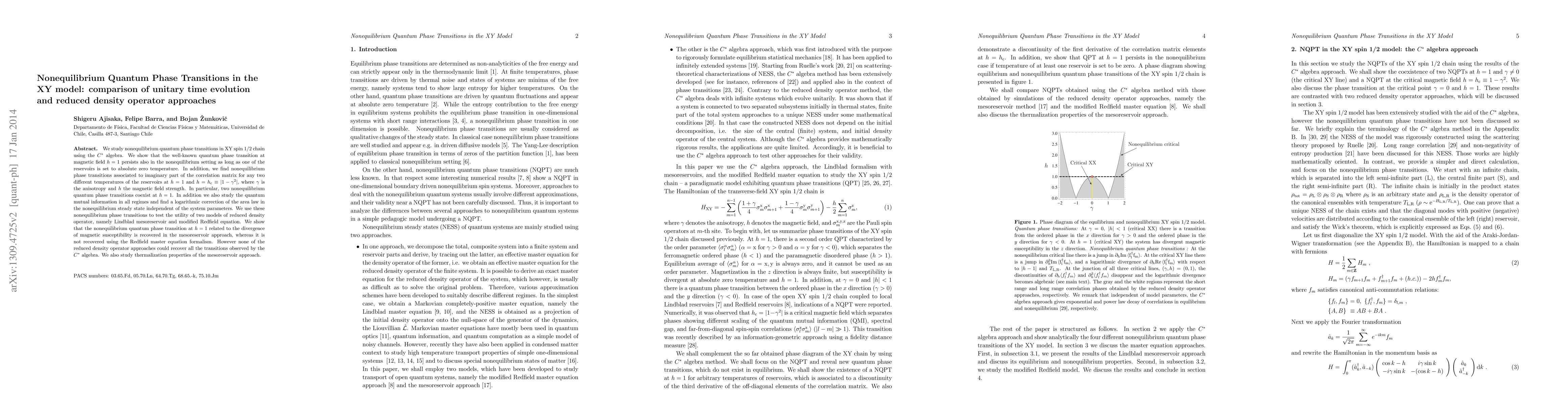 We study nonequilibrium quantum phase transitions in XY spin 1/2 chain using the $C^*$ algebra. We show that the well-known quantum phase transition at magnetic field $h = 1$ persists also in the nonequilibrium setting as long as one of the reservoirs is set to absolute zero temperature. In addition, we find nonequilibrium phase transitions associated to imaginary part of the correlation matrix for any two different temperatures of the reservoirs at $h = 1$ and $h = h_{\rm c} \equiv|1-\gamma^2|$, where $\gamma$ is the anisotropy and $h$ the magnetic field strength. In particular, two nonequilibrium quantum phase transitions coexist at $h=1$. In addition we also study the quantum mutual information in all regimes and find a logarithmic correction of the area law in the nonequilibrium steady state independent of the system parameters. We use these nonequilibrium phase transitions to test the utility of two models of reduced density operator, namely Lindblad mesoreservoir and modified Redfield equation. We show that the nonequilibrium quantum phase transition at $h = 1$ related to the divergence of magnetic susceptibility is recovered in the mesoreservoir approach, whereas it is not recovered using the Redfield master equation formalism. However none of the reduced density operator approaches could recover all the transitions observed by the $C^*$ algebra. We also study thermalization properties of the mesoreservoir approach.