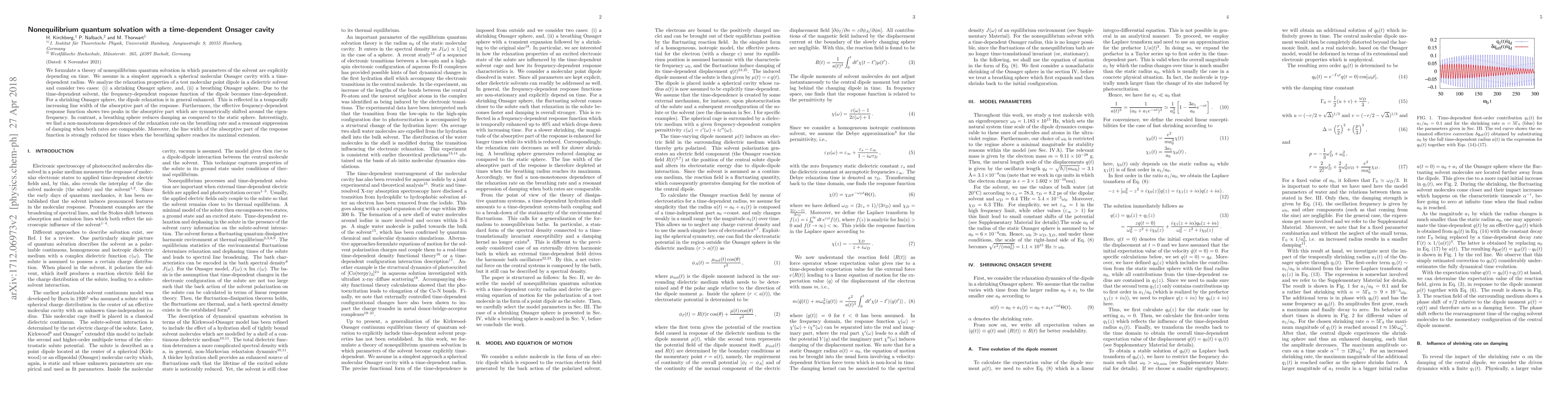 We formulate a theory of nonequilibrium quantum solvation in which parameters of the solvent are explicitly depending on time. We assume in a simplest approach a spherical molecular Onsager cavity with a time-dependent radius. We analyze the relaxation properties of a test molecular point dipole in a dielectric solvent and consider two cases: (i) a shrinking Onsager sphere, and, (ii) a breathing Onsager sphere. Due to the time-dependent solvent, the frequency-dependent response function of the dipole becomes time-dependent. For a shrinking Onsager sphere, the dipole relaxation is in general enhanced. This is reflected in a temporally increasing line width of the absorptive part of the response. Furthermore, the effective frequency-dependent response function shows two peaks in the absorptive part which are symmetrically shifted around the eigenfrequency. In contrast, a breathing sphere reduces damping as compared to the static sphere. Interestingly, we find a non-monotonous dependence of the relaxation rate on the breathing rate and a resonant suppression of damping when both rates are comparable. Moreover, the line width of the absorptive part of the response function is strongly reduced for times when the breathing sphere reaches its maximal extension.