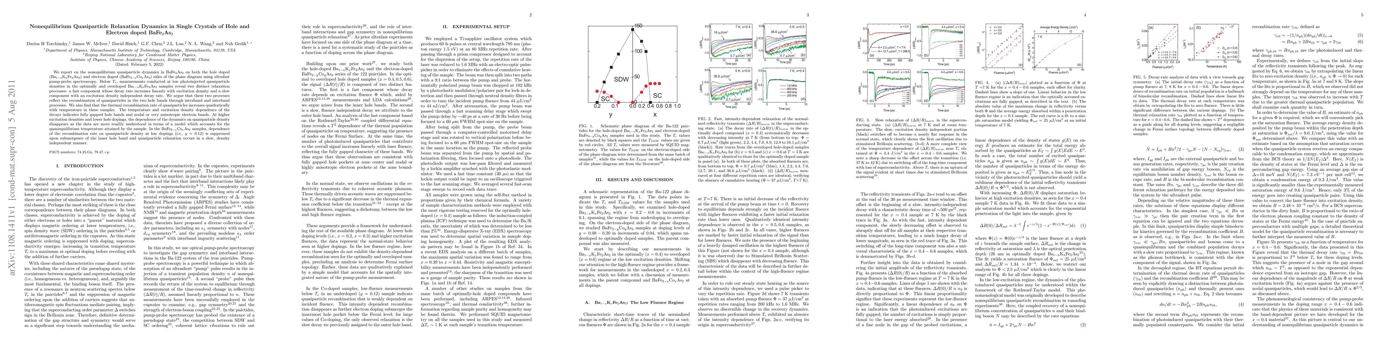 This paper investigates nonequilibrium quasiparticle relaxation in hole-doped and electron-doped BaFe$_2$As$_2$ using ultrafast spectroscopy, revealing distinct relaxation processes in hole bands and a density-independent recombination in electron-doped samples. The findings suggest fully gapped hole bands and anisotropic electron bands.