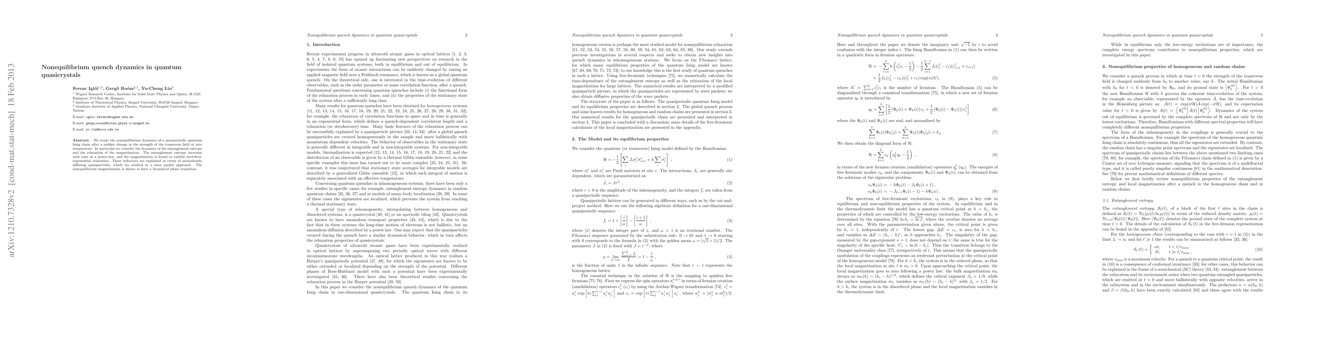 This paper investigates the nonequilibrium dynamics of a quasiperiodic quantum Ising chain following a sudden field change, finding power-law growth in entanglement entropy and stretched-exponential relaxation in magnetization due to anomalously diffusing quasiparticles, with a dynamical phase transition in magnetization.