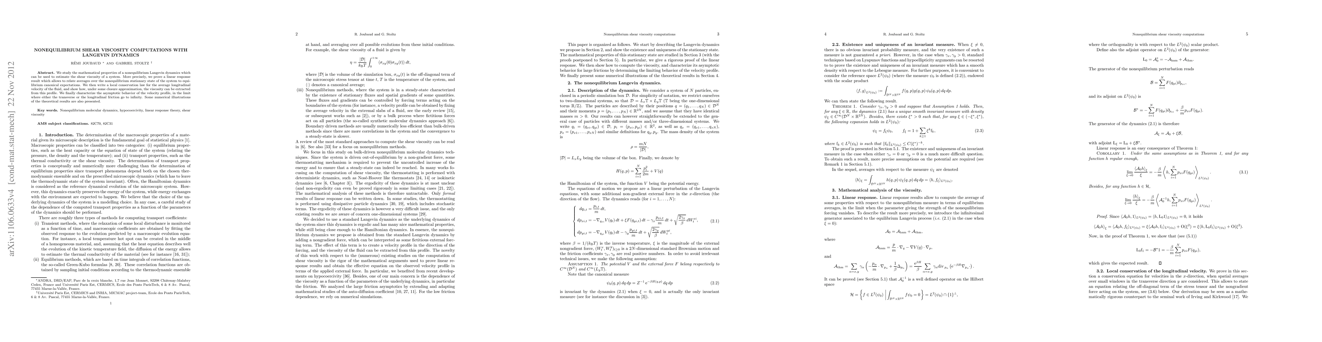 This paper develops a nonequilibrium Langevin dynamics method to compute shear viscosity, proving a linear response relation linking nonequilibrium averages to equilibrium expectations. It derives a local conservation law for fluid velocity and extracts viscosity through a closure approximation, with numerical illustrations validating the theoretical results.