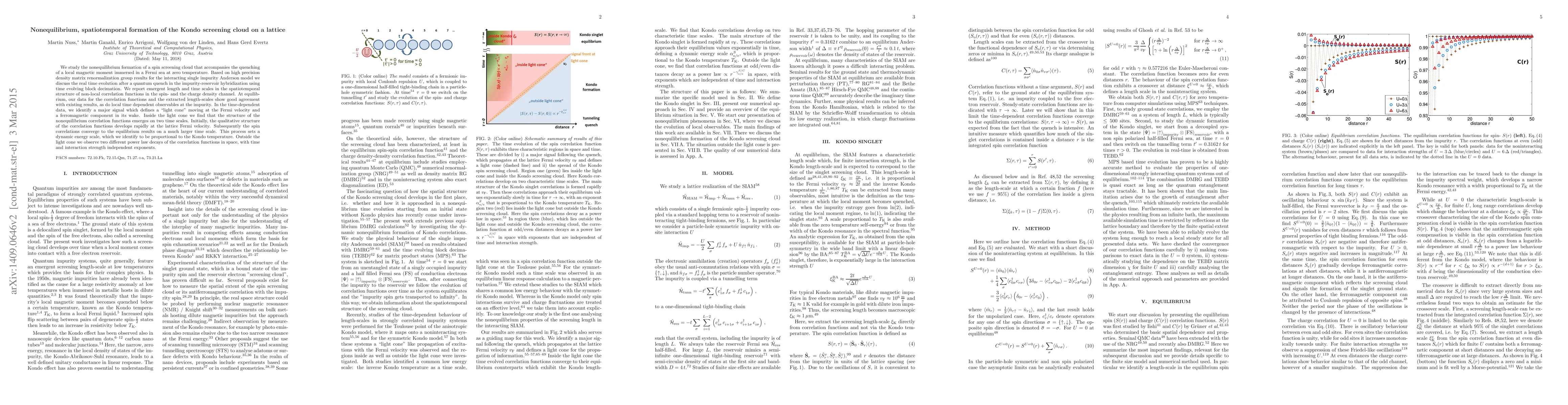 We study the nonequilibrium formation of a spin screening cloud that accompanies the quenching of a local magnetic moment immersed in a Fermi sea at zero temperature. Based on high precision density matrix renormalization group results for the interacting single impurity Anderson model we discuss the real time evolution after a quantum quench in the impurity-reservoir hybridization using time evolving block decimation. We report emergent length and time scales in the spatiotemporal structure of non-local correlation functions in the spin- and the charge density channel. At equilibrium, our data for the correlation functions and the extracted length-scales show good agreement with existing results, as do local time dependent observables at the impurity. In the time-dependent data, we identify a major signal which defines a "light cone" moving at the Fermi velocity and a ferromagnetic component in its wake. Inside the light cone we find that the structure of the nonequilibrium correlation functions emerges on two time scales. Initially, the qualitative structure of the correlation functions develops rapidly at the lattice Fermi velocity. Subsequently the spin correlations converge to the equilibrium results on a much larger time scale. This process sets a dynamic energy scale, which we identify to be proportional to the Kondo temperature. Outside the light cone we observe two different power law decays of the correlation functions in space, with time and interaction strength independent exponents.