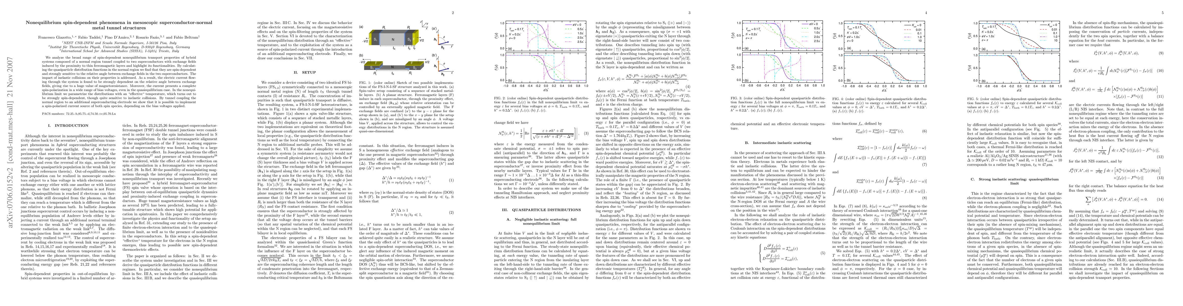 This paper investigates spin-dependent nonequilibrium transport in mesoscopic superconductor-normal metal tunnel structures, revealing strong spin-dependent quasiparticle distributions and significant magnetoresistance. The study also demonstrates the potential for generating spin-polarized currents and a spin-polarized current source via bias voltages.
