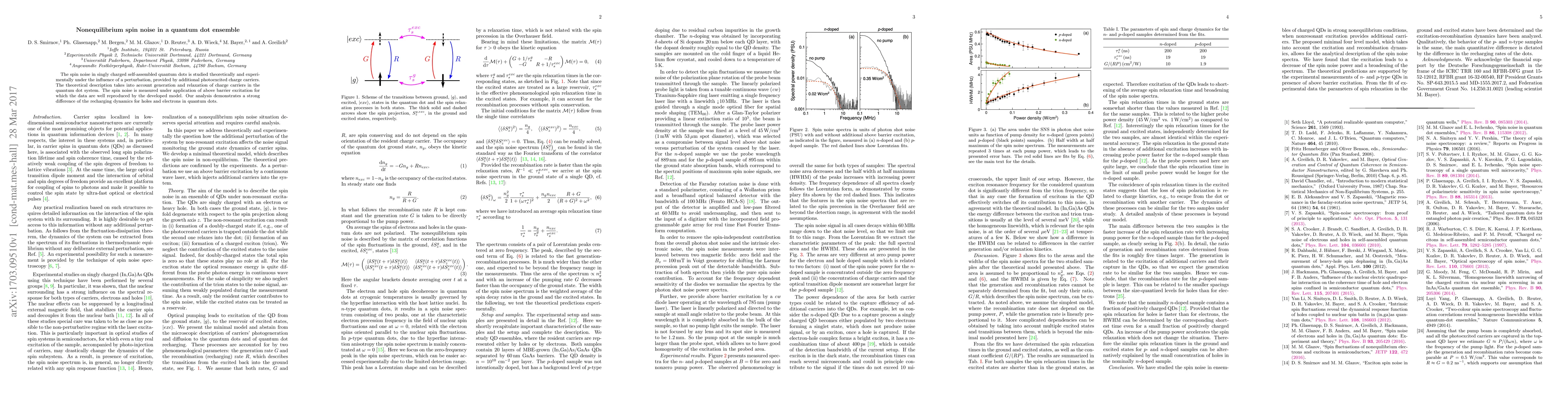 This paper investigates both theoretically and experimentally the spin noise in quantum dot ensembles under perturbations from photoexcited charge carriers. The developed model accurately reproduces the measured spin noise data, revealing distinct recharging dynamics between holes and electrons in quantum dots.