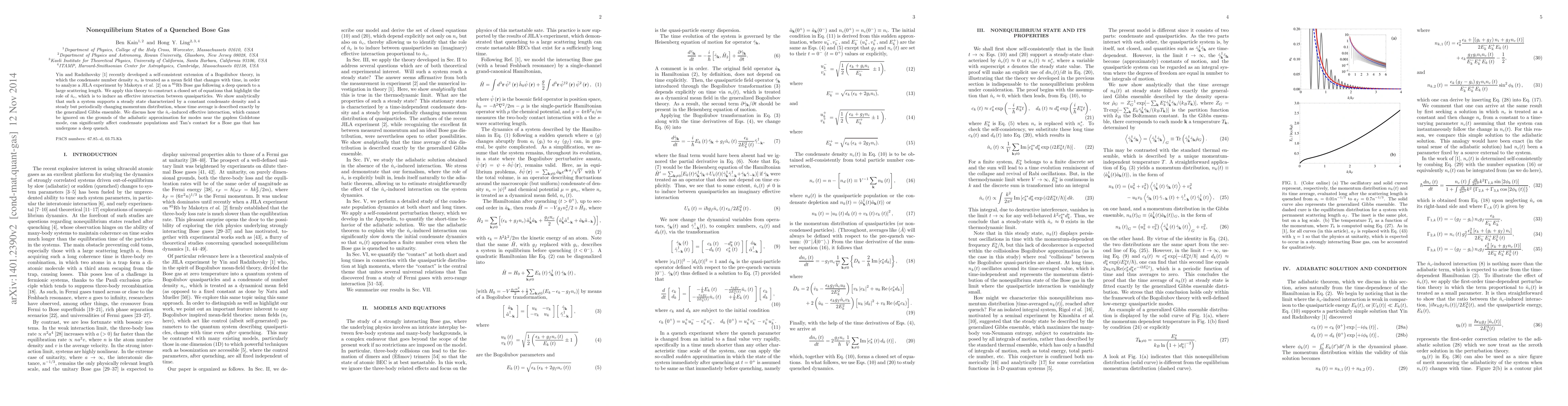 Yin and Radzihovsky [1] recently developed a self-consistent extension of a Bogoliubov theory, in which the condensate number density $n_c$ is treated as a mean field that changes with time, in order to analyze a JILA experiment by Makotyn et al. [2] on a $^{85}$Rb Bose gas following a deep quench to a large scattering length. We apply this theory to construct a closed set of equations that highlight the role of $\dot{n}_c$, which is to induce an effective interaction between quasiparticles. We show analytically that such a system supports a steady state characterized by a constant condensate density and a steady but periodically changing momentum distribution, whose time average is described exactly by the generalized Gibbs ensemble. We discuss how the $\dot{n}_{c}$-induced effective interaction, which cannot be ignored on the grounds of the adiabatic approximation for modes near the gapless Goldstone mode, can significantly affect condensate populations and Tan's contact for a Bose gas that has undergone a deep quench.
