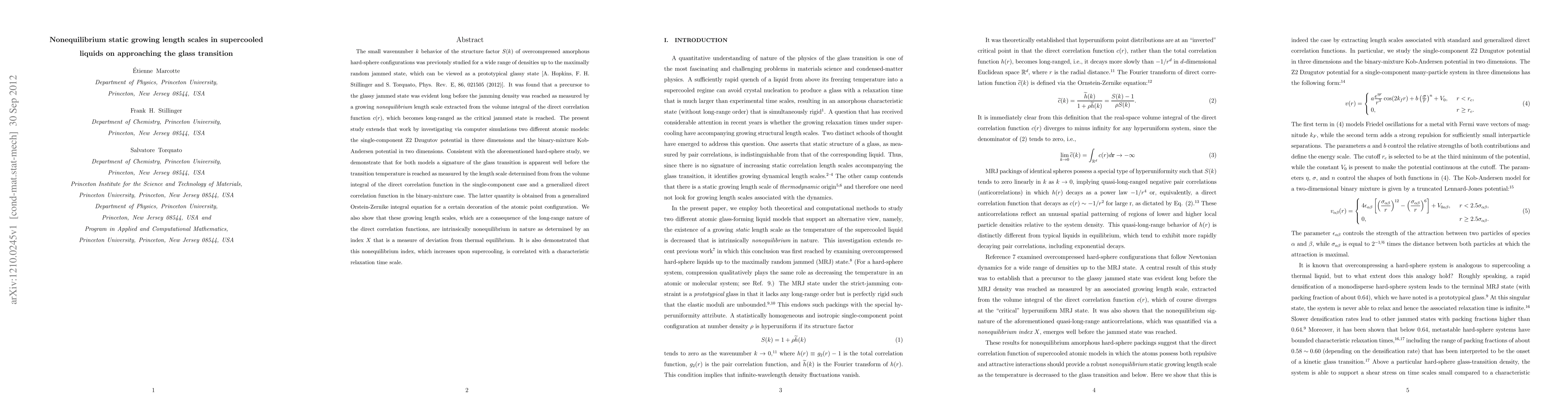 The small wavenumber $k$ behavior of the structure factor $S(k)$ of overcompressed amorphous hard-sphere configurations was previously studied for a wide range of densities up to the maximally random jammed state, which can be viewed as a prototypical glassy state [A. Hopkins, F. H. Stillinger and S. Torquato, Phys. Rev. E, 86, 021505 (2012)]. It was found that a precursor to the glassy jammed state was evident long before the jamming density was reached as measured by a growing nonequilibrium length scale extracted from the volume integral of the direct correlation function $c(r)$, which becomes long-ranged as the critical jammed state is reached. The present study extends that work by investigating via computer simulations two different atomic models: the single-component Z2 Dzugutov potential in three dimensions and the binary-mixture Kob-Andersen potential in two dimensions. Consistent with the aforementioned hard-sphere study, we demonstrate that for both models a signature of the glass transition is apparent well before the transition temperature is reached as measured by the length scale determined from from the volume integral of the direct correlation function in the single-component case and a generalized direct correlation function in the binary-mixture case. The latter quantity is obtained from a generalized Orstein-Zernike integral equation for a certain decoration of the atomic point configuration. We also show that these growing length scales, which are a consequence of the long-range nature of the direct correlation functions, are intrinsically nonequilibrium in nature as determined by an index $X$ that is a measure of deviation from thermal equilibrium. It is also demonstrated that this nonequilibrium index, which increases upon supercooling, is correlated with a characteristic relaxation time scale.