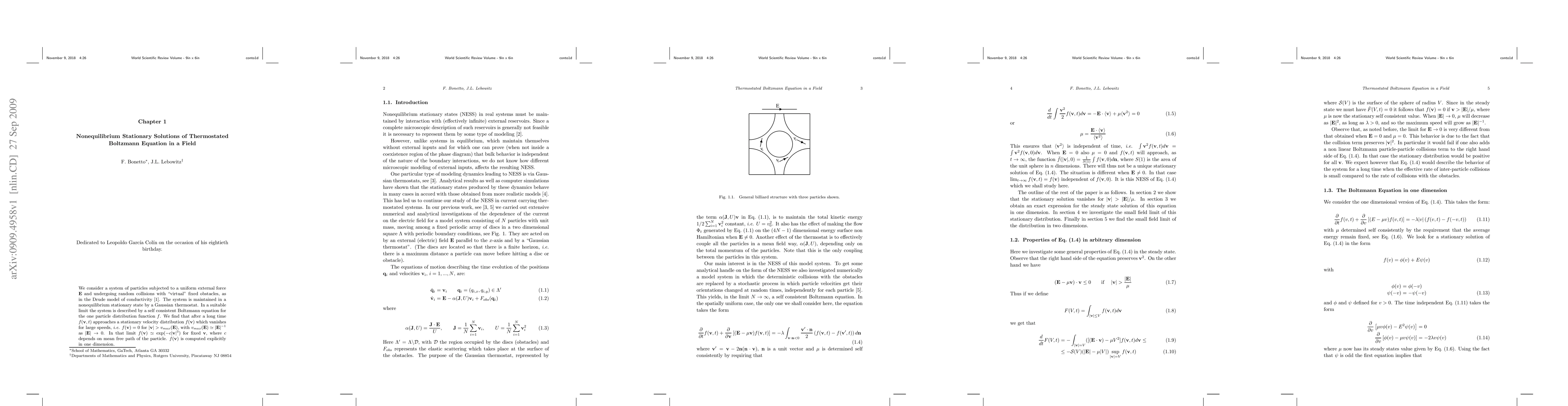 This paper investigates a system of particles under an external force and random collisions, governed by a thermostated Boltzmann equation. The long-term velocity distribution f(v) approaches a stationary form that vanishes for high speeds and is explicitly computed in one dimension.