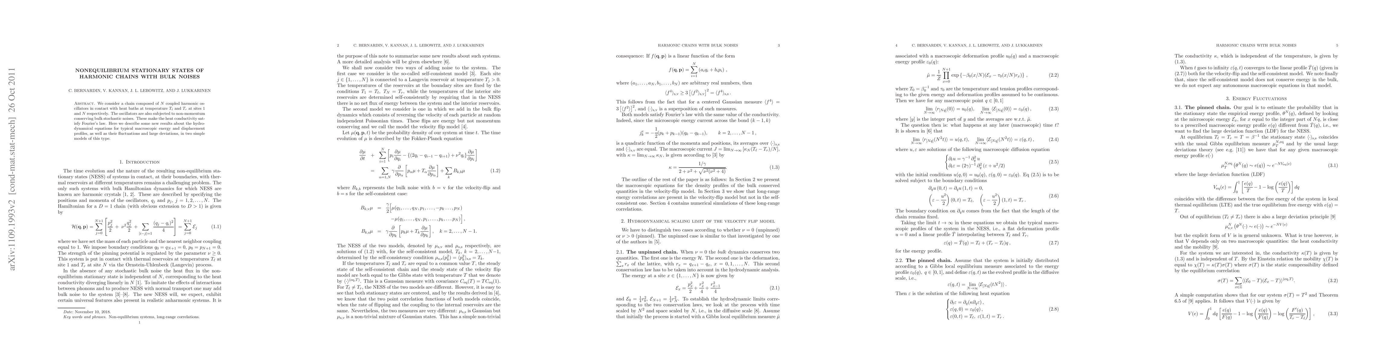 This paper investigates the nonequilibrium stationary states of harmonic oscillator chains with bulk stochastic noises, focusing on macroscopic energy and displacement profiles, their fluctuations, and large deviations in two simple models. The study reveals how these noises influence heat conductivity according to Fourier's law.