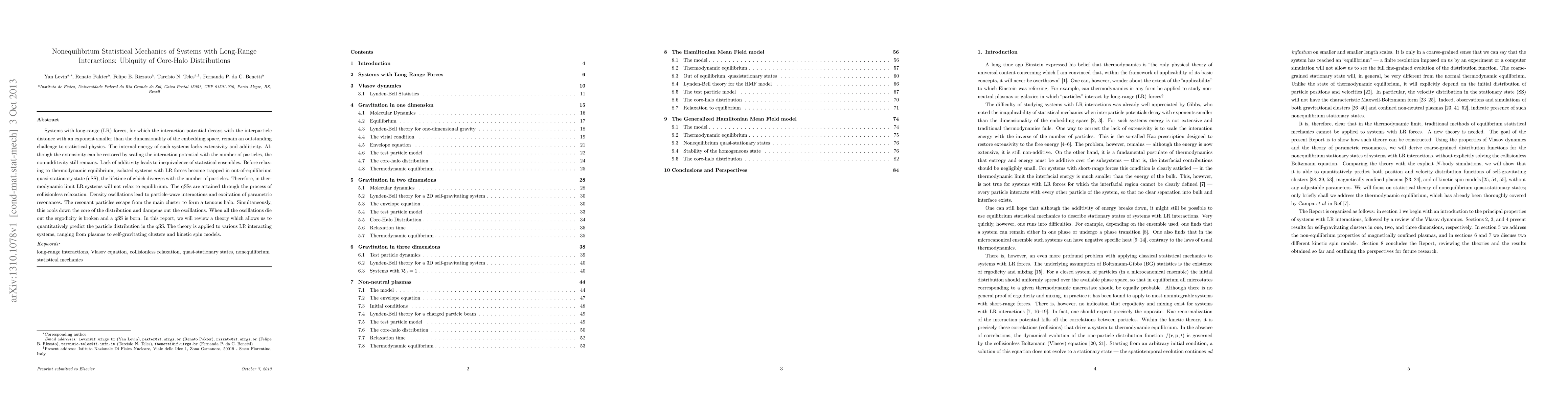 This paper explores the nonequilibrium statistical mechanics of systems with long-range interactions, demonstrating that such systems do not reach equilibrium due to the lack of additivity in their internal energy. It introduces a theory predicting the core-halo distribution in quasi-stationary states formed through collisionless relaxation, applicable to diverse systems including plasmas and self-gravitating clusters.