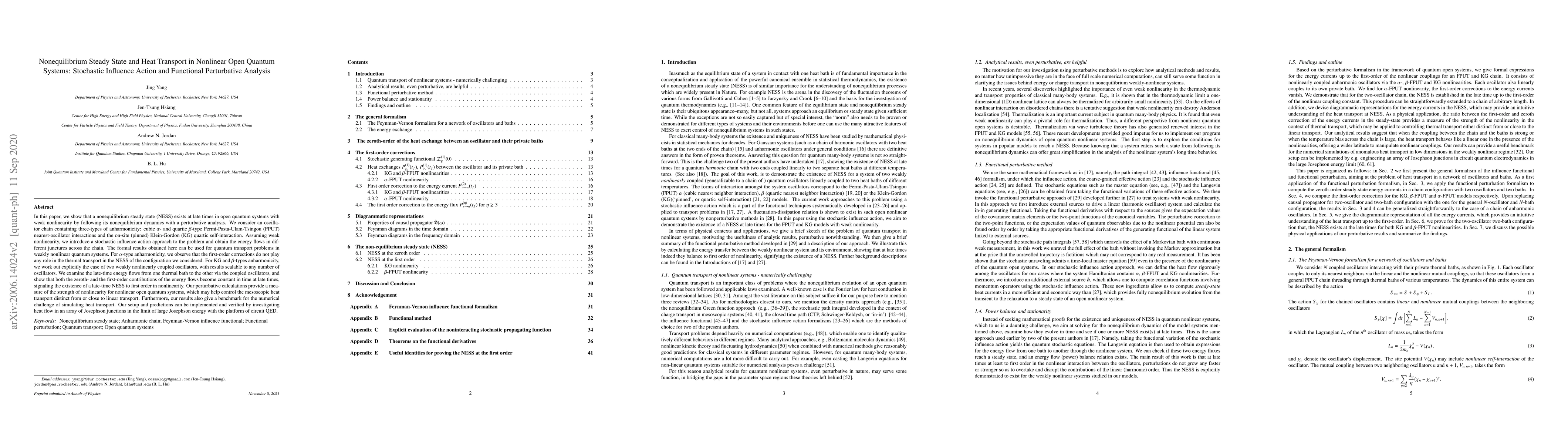 In this paper, we show that a nonequilibrium steady state (NESS) exists at late times in open quantum systems with weak nonlinearity by following its nonequilibrium dynamics with a perturbative analysis. Here we consider an oscillator chain containing three-types of anharmonicity in the Fermi-Pasta-Ulam-Tsingou (FPUT) model: cubic $\alpha$- and quartic $\beta$-type nearest-oscillator interactions and the on-site (pinned) Klein-Gordon (KG) quartic self-interaction. Assuming weak nonlinearity, we introduce a stochastic influence action approach to the problem and obtain the energy flow in different junctures of the chain. The formal results obtained here can be used for quantum transport problems in weakly nonlinear quantum systems. For $\alpha$-type anharmonicity, we observe that the first-order corrections do not play any role in the thermal transport in the NESS of the configuration we considered. For KG and $\beta$-types anharmonicity, we work out explicitly the case of two weakly nonlinearly coupled oscillators, with results scalable to any number of oscillators. We examine the late-time energy flows from one thermal bath to the other via the coupled oscillators, and show that both the zeroth- and the first-order contributions of the energy flow become constant in time at late times, signaling the existence of a late-time NESS to first order in nonlinearity. Our perturbative calculations provide a measure of the strength of nonlinearity for nonlinear open quantum systems, which may help control the mesoscopic heat transport distinct from or close to linear transport. Furthermore, our results also give a benchmark for the numerical challenge of simulating heat transport. Our setup and predictions can be implemented and verified by investigating heat flow in an array of Josephson junctions in the limit of large Josephson energy with the platform of circuit QED.