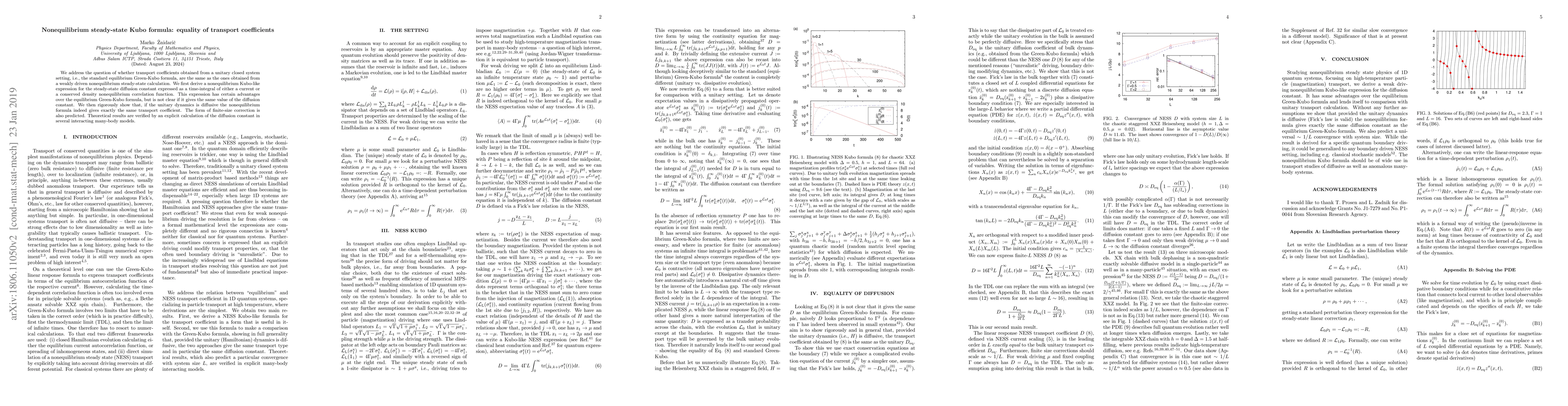 This paper investigates whether transport coefficients derived from equilibrium and nonequilibrium systems are equivalent. It derives a nonequilibrium Kubo formula and proves that, under diffusive unitary dynamics, it yields identical transport coefficients as the equilibrium Green-Kubo formula, with theoretical predictions verified through calculations in various interacting many-body models.