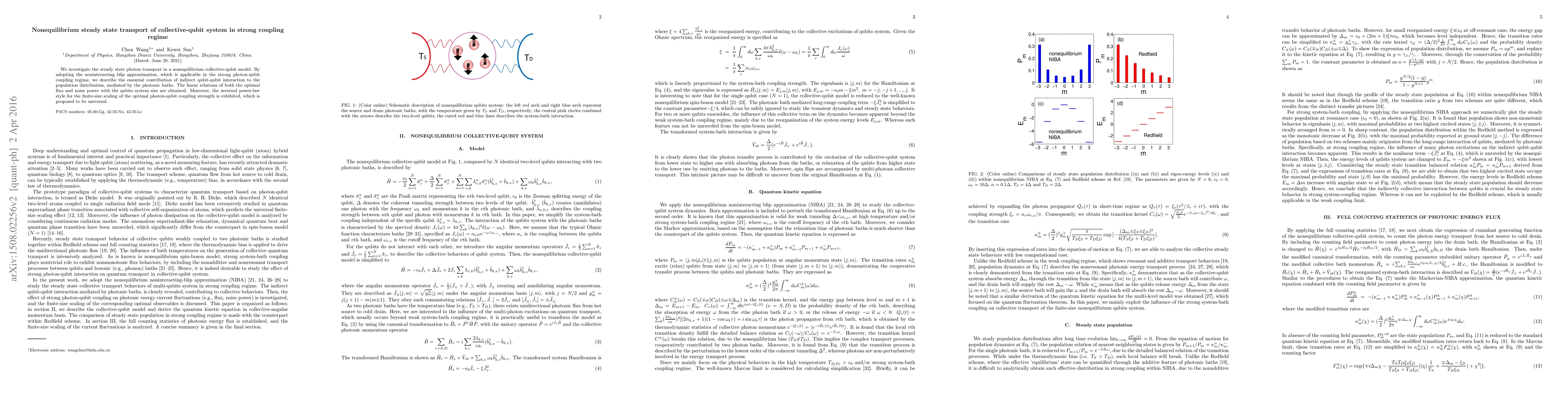 This paper explores photon transport in a nonequilibrium collective-qubit system under strong coupling, revealing the indirect qubit-qubit interaction mediated by photonic baths. It finds linear relations for optimal flux and noise power with system size and a universal inverse power-law for the finite-size scaling of optimal photon-qubit coupling strength.