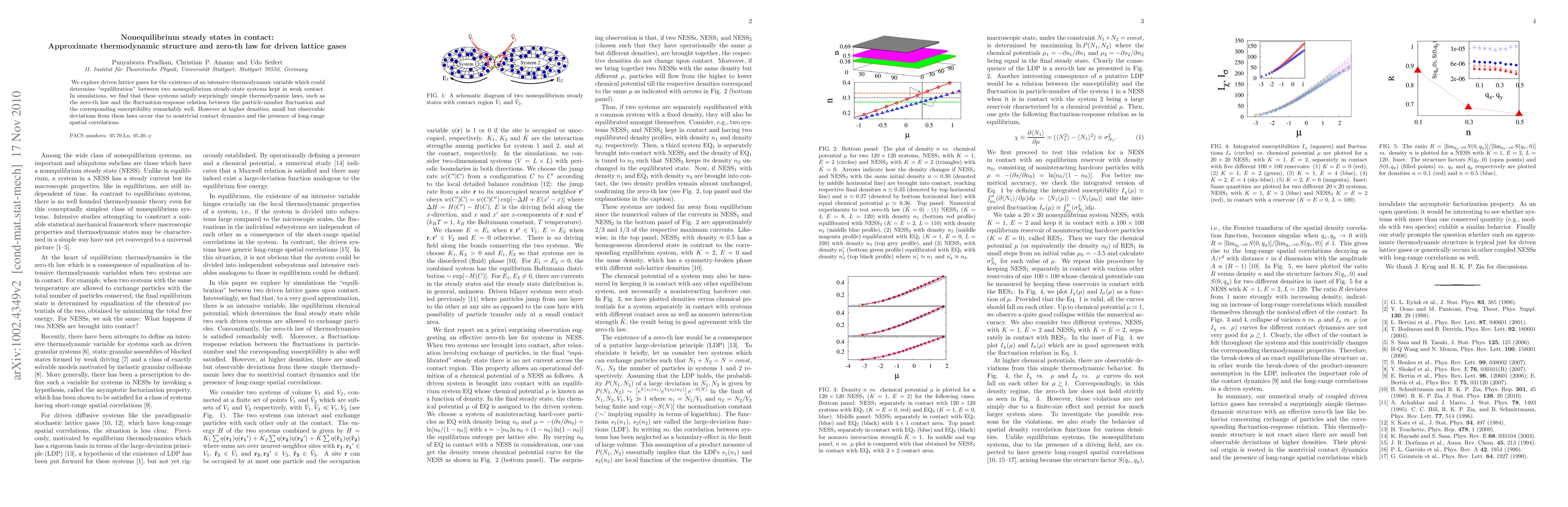 This paper investigates driven lattice gases to identify an intensive thermodynamic variable that governs equilibration between nonequilibrium steady-state systems in weak contact. Simulations reveal adherence to simple thermodynamic laws, including the zero-th law, though deviations arise at higher densities due to complex contact dynamics and spatial correlations.