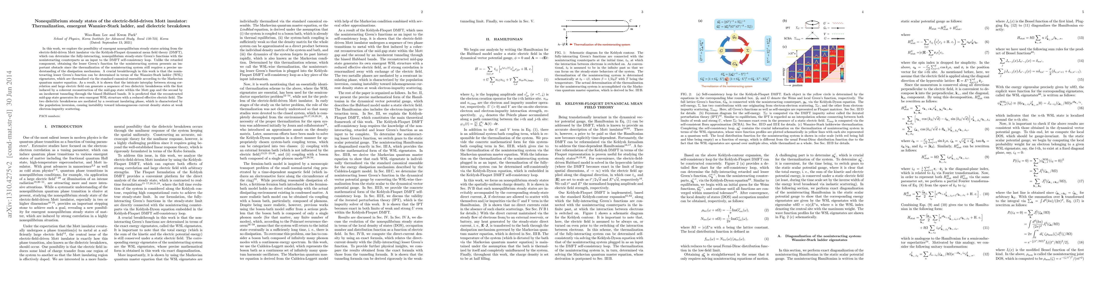 In this work, we explore the possibility of emergent nonequilibrium steady states arising from the electric-field-driven Mott insulator via the Keldysh-Floquet dynamical mean field theory (DMFT), which can determine the fully-interacting, nonequilibrium steady-state Green's functions with the noninteracting counterparts as an input to the DMFT self-consistency loop. Unlike the retarded component, obtaining the lesser Green's function for the noninteracting system presents an important obstacle since the thermalization of the noninteracting system still requires a precise understanding of the dissipation mechanism. A crucial breakthrough in this work is that the noninteracting lesser Green's function can be determined in terms of the Wannier-Stark ladder (WSL) eigenstates, which are thermalized via the standard canonical ensemble according to the Markovian quantum master equation. As a result, it is shown that the intricate interplay between strong correlation and large electric field can generate a sequence of two dielectric breakdowns with the first induced by a coherent reconstruction of the mid-gap state within the Mott gap and the second by an incoherent tunneling through the biased Hubbard bands. It is predicted that the reconstructed mid-gap state generates its own emergent WSL structure with a reduced effective electric field. The two dielectric breakdowns are mediated by a reentrant insulating phase, which is characterized by the population inversion, causing instability toward inhomogeneous current density states at weak electron-impurity scattering.