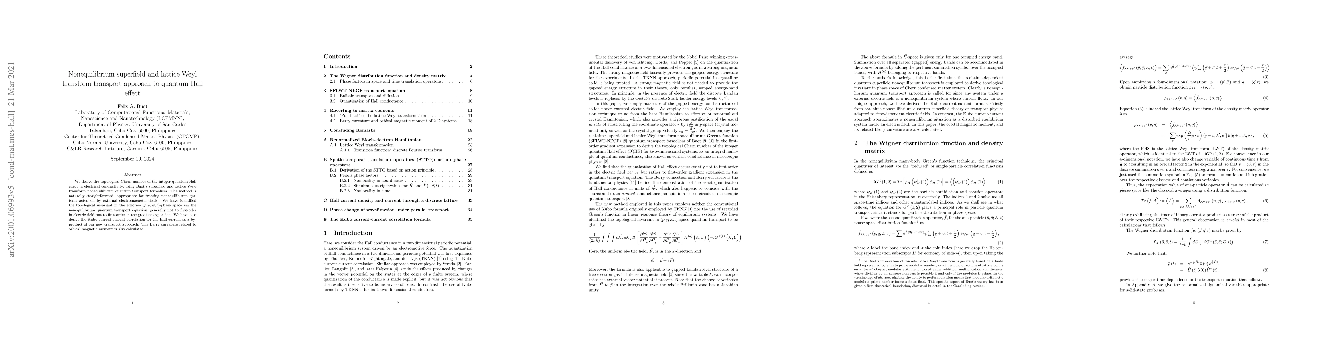 This paper derives the topological Chern number of the integer quantum Hall effect using Buot's nonequilibrium superfield and lattice Weyl transform transport formalism. The method identifies the topological invariant in effective phase space and derives the Kubo current-current correlation for the Hall current, calculating the Berry curvature related to the orbital magnetic moment.