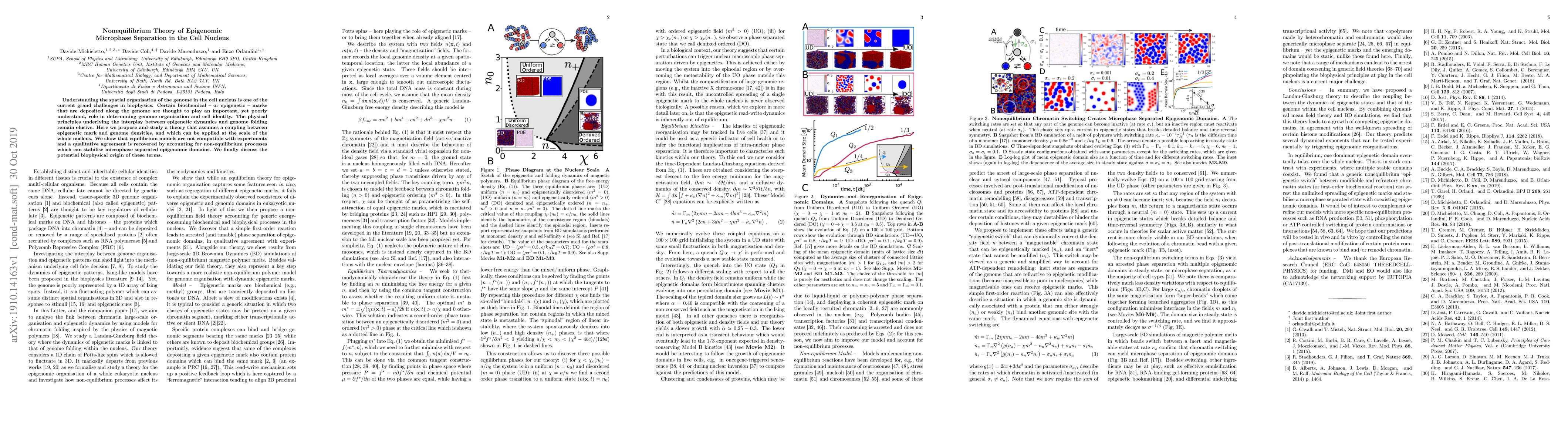 Understanding the spatial organisation of the genome in the cell nucleus is one of the current grand challenges in biophysics. Certain biochemical -- or epigenetic -- marks that are deposited along the genome are thought to play an important, yet poorly understood, role in determining genome organisation and cell identity. The physical principles underlying the interplay between epigenetic dynamics and genome folding remain elusive. Here we propose and study a theory that assumes a coupling between epigenetic mark and genome densities, and which can be applied at the scale of the whole nucleus. We show that equilibrium models are not compatible with experiments and a qualitative agreement is recovered by accounting for non-equilibrium processes which can stabilise microphase separated epigenomic domains. We finally discuss the potential biophysical origin of these terms.