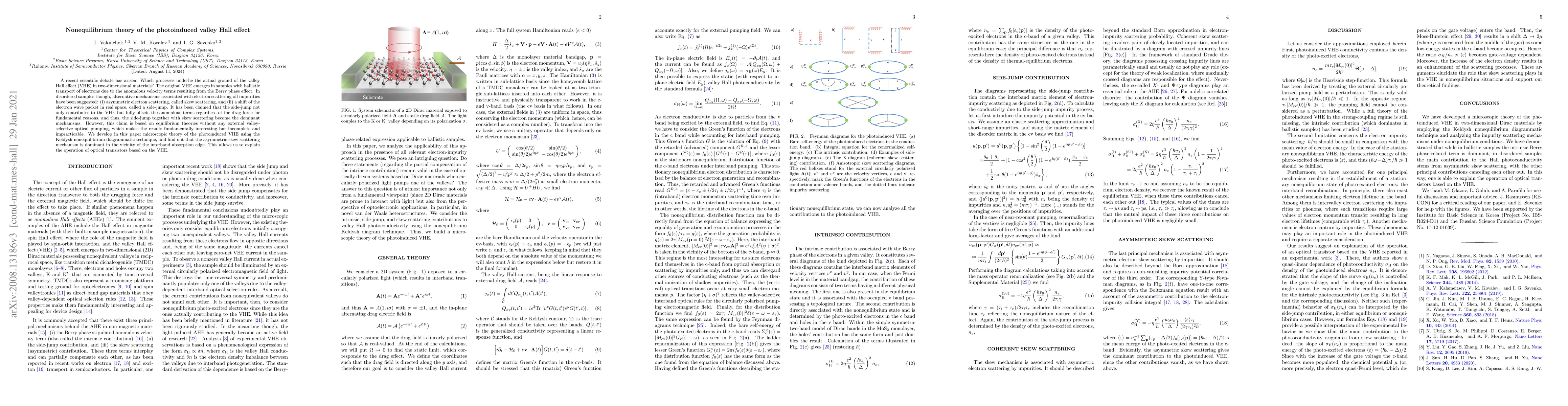 A recent scientific debate has arisen: Which processes underlie the actual ground of the valley Hall effect (VHE) in two-dimensional materials? The original VHE emerges in samples with ballistic transport of electrons due to the anomalous velocity terms resulting from the Berry phase effect. In disordered samples though, alternative mechanisms associated with electron scattering off impurities have been suggested: (i) asymmetric electron scattering, called skew scattering, and (ii) a shift of the electron wave packet in real space, called a side jump. It has been claimed that the side jump not only contributes to the VHE but fully offsets the anomalous terms regardless of the drag force for fundamental reasons and, thus, the side-jump together with skew scattering become the dominant mechanisms. However, this claim is based on equilibrium theories without any external valley-selective optical pumping, which makes the results fundamentally interesting but incomplete and impracticable. We develop in this paper a microscopic theory of the photoinduced VHE using the Keldysh nonequilibrium diagrammatic technique and find that the asymmetric skew scattering mechanism is dominant in the vicinity of the interband absorption edge. This allows us to explain the operation of optical transistors based on the VHE.