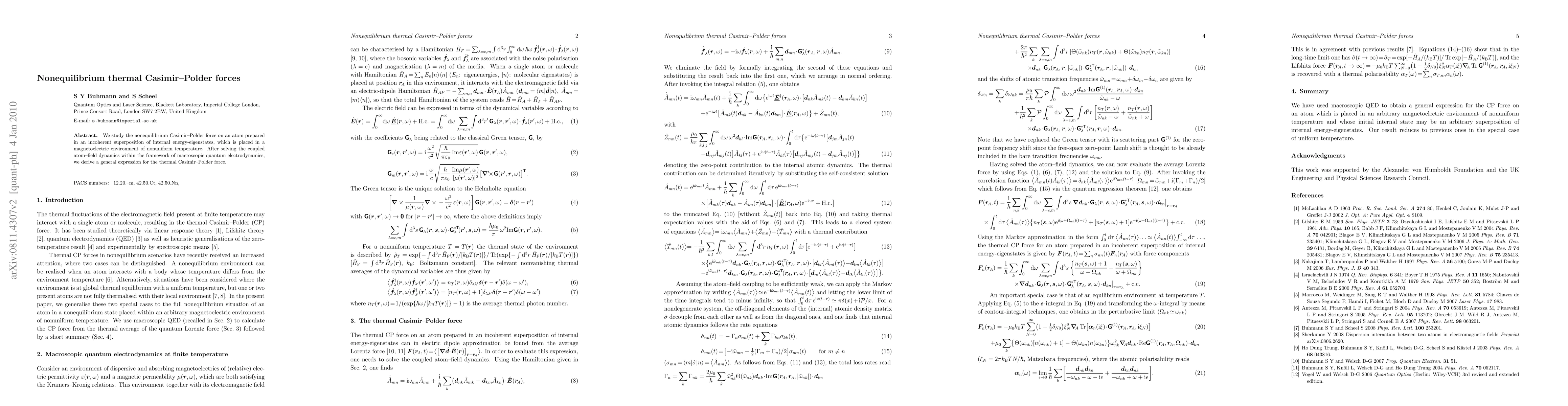 This paper investigates the nonequilibrium Casimir-Polder force acting on an atom in an incoherent superposition of internal states within a magnetoelectric environment of varying temperature. The authors derive a general expression for the thermal Casimir-Polder force using macroscopic quantum electrodynamics.