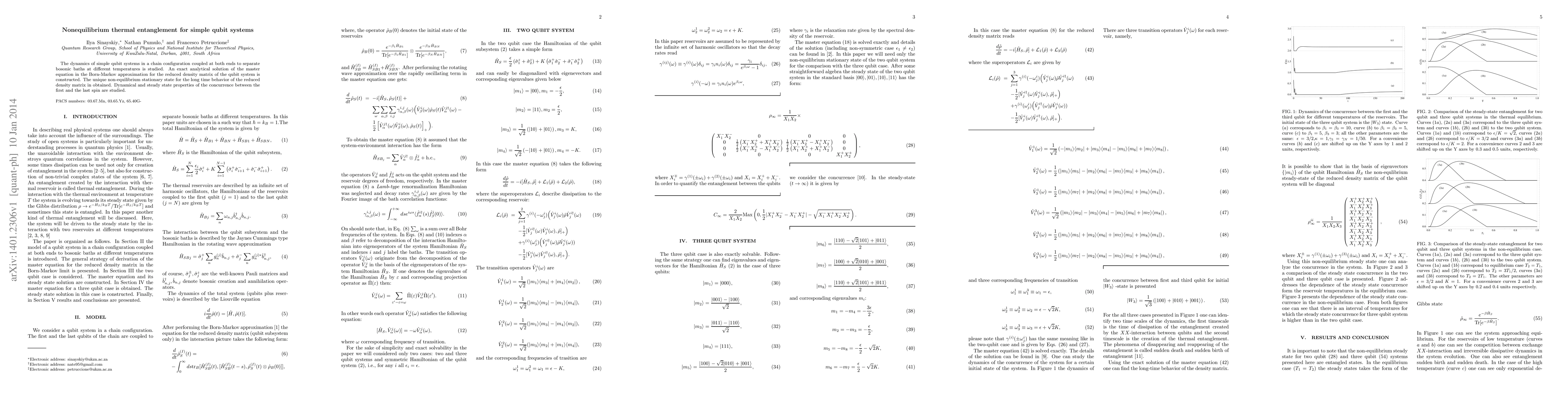 The dynamics of simple qubit systems in a chain configuration coupled at both ends to separate bosonic baths at different temperatures is studied. An exact analytical solution of the master equation in the Born-Markov approximation for the reduced density matrix of the qubit system is constructed. The unique non-equilibrium stationary state for the long time behavior of the reduced density matrix in obtained. Dynamical and steady state properties of the concurrence between the first and the last spin are studied.