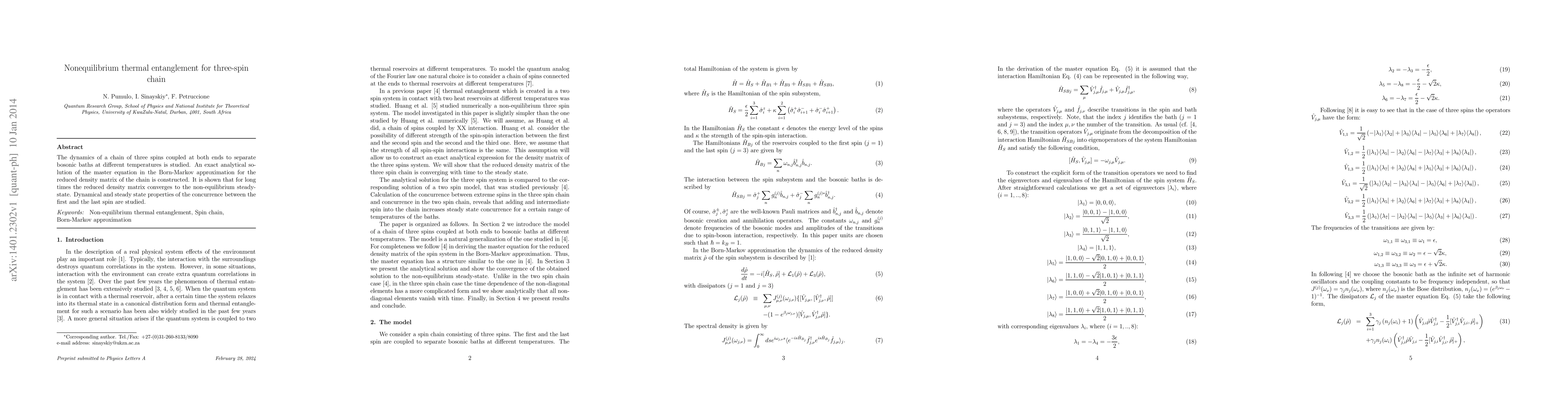 The dynamics of a chain of three spins coupled at both ends to separate bosonic baths at different temperatures is studied. An exact analytical so- lution of the master equation in the Born-Markov approximation for the reduced density matrix of the chain is constructed. It is shown that for long times the reduced density matrix converges to the non-equilibrium steady- state. Dynamical and steady state properties of the concurrence between the first and the last spin are studied.