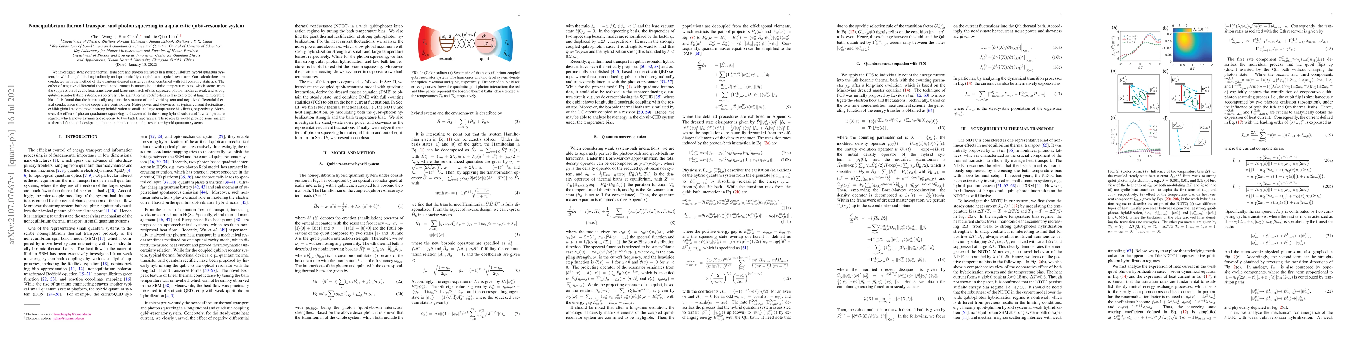 This research explores thermal transport and photon behavior in a hybrid quantum system of a qubit coupled to an optical resonator. Utilizing the quantum dressed master equation and full counting statistics, the study reveals negative differential thermal conductance at finite temperature differences, caused by suppressed heat transitions and photon mode mismatches. The system demonstrates giant thermal rectification, asymmetric noise power and skewness, and photon quadrature squeezing in specific conditions. These findings offer insights into thermal functionality and photon manipulation in qubit-resonator systems.