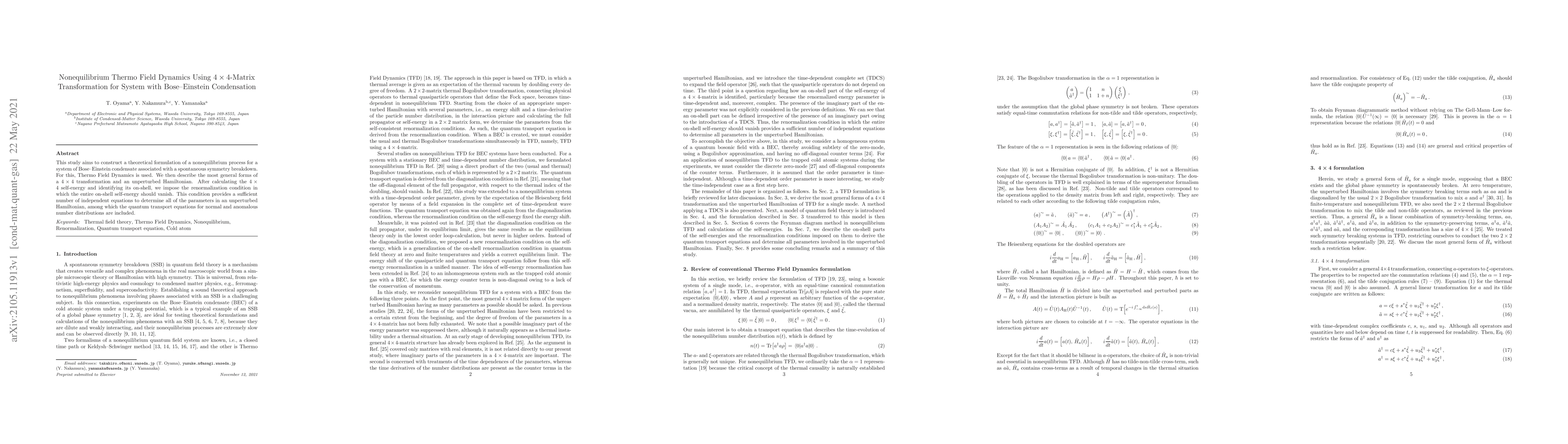 This study aims to construct a theoretical formulation of a nonequilibrium process for a system of Bose--Einstein condensate associated with a spontaneous symmetry breakdown. For this, Thermo Field Dynamics is used. We then describe the most general forms of a 4x4 transformation and an unperturbed Hamiltonian. After calculating the $4\times 4$ self-energy and identifying its on-shell, we impose the renormalization condition in which the entire on-shell self-energy should vanish. This condition provides a sufficient number of independent equations to determine all of the parameters in an unperturbed Hamiltonian, among which the quantum transport equations for normal and anomalous number distributions are included.