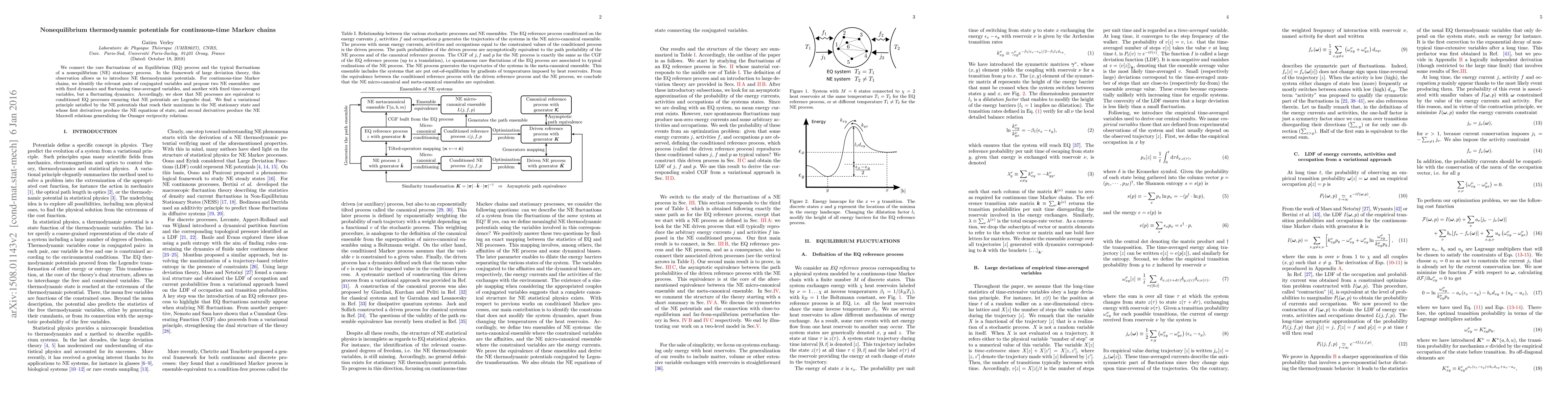 This paper introduces nonequilibrium thermodynamic potentials for continuous-time Markov chains using large deviation theory, proposing two new ensembles. It establishes a variational principle that maximizes these potentials in the nonequilibrium stationary state, and derives nonequilibrium Maxwell relations.