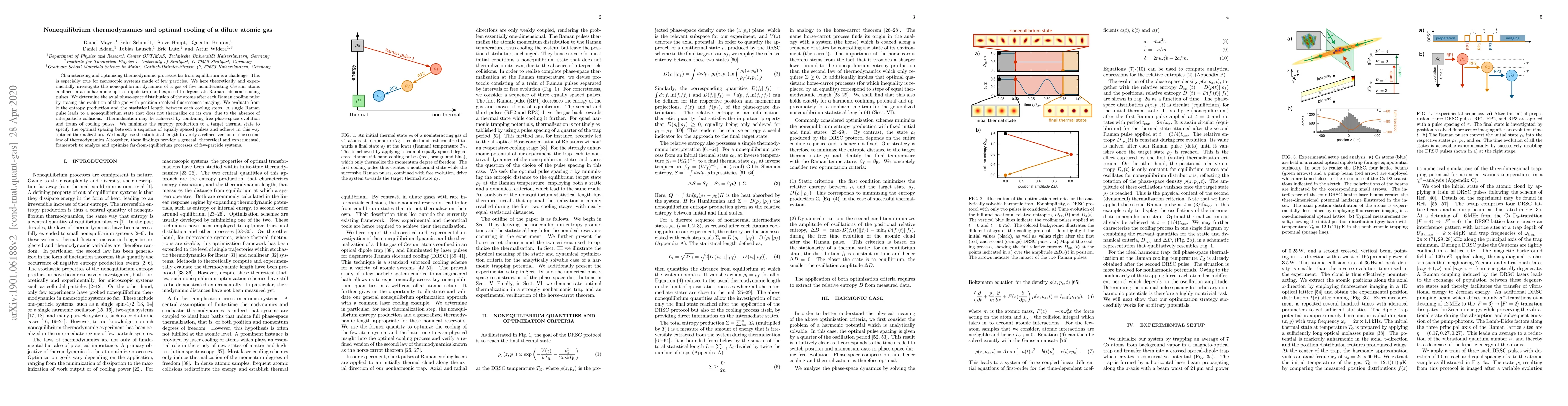 Characterizing and optimizing thermodynamic processes far from equilibrium is a challenge. This is especially true for nanoscopic systems made of few particles. We here theoretically and experimentally investigate the nonequilibrium dynamics of a gas of few noninteracting Cesium atoms confined in a nonharmonic optical dipole trap and exposed to degenerate Raman sideband cooling pulses. We determine the axial phase-space distribution of the atoms after each Raman cooling pulse by tracing the evolution of the gas with position-resolved fluorescence imaging. We evaluate from it the entropy production and the statistical length between each cooling steps. A single Raman pulse leads to a nonequilibrium state that does not thermalize on its own, due to the absence of interparticle collisions. Thermalization may be achieved by combining free phase-space evolution and trains of cooling pulses. We minimize the entropy production to a target thermal state to specify the optimal spacing between a sequence of equally spaced pulses and achieve in this way optimal thermalization. We finally use the statistical length to verify a refined version of the second law of thermodynamics. Altogether, these findings provide a general, theoretical and experimental, framework to analyze and optimize far-from-equilibrium processes of few-particle systems.