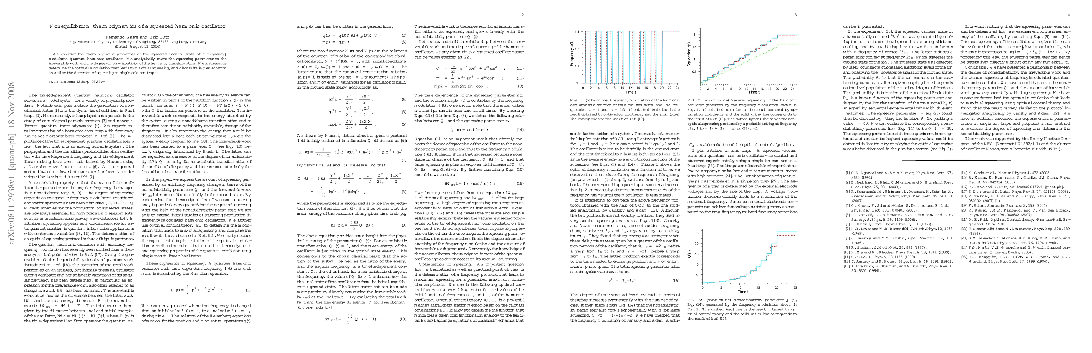 This paper explores the thermodynamic properties of a squeezed vacuum state in a frequency-modulated quantum harmonic oscillator, linking the squeezing parameter with irreversible work and nonadiabaticity. It identifies the optimal modulation for maximal squeezing and discusses its practical implementation and detection in cold ion traps.