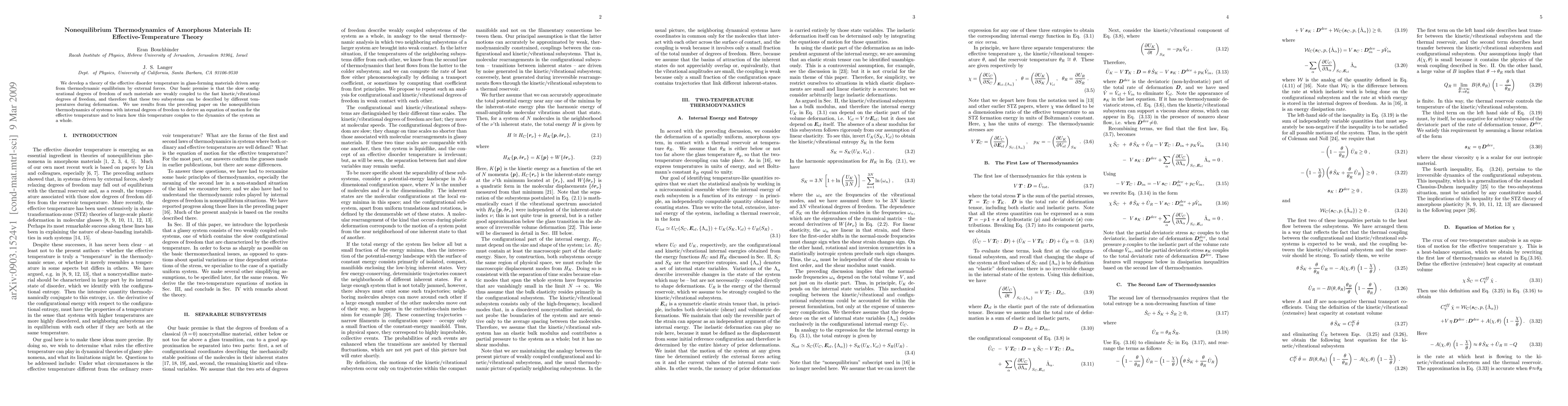 We develop a theory of the effective disorder temperature in glass-forming materials driven away from thermodynamic equilibrium by external forces. Our basic premise is that the slow configurational degrees of freedom of such materials are weakly coupled to the fast kinetic/vibrational degrees of freedom, and therefore that these two subsystems can be described by different temperatures during deformation. We use results from the preceding paper on the nonequilibrium thermodynamics of systems with internal degrees of freedom to derive an equation of motion for the effective temperature and to learn how this temperature couples to the dynamics of the system as a whole.