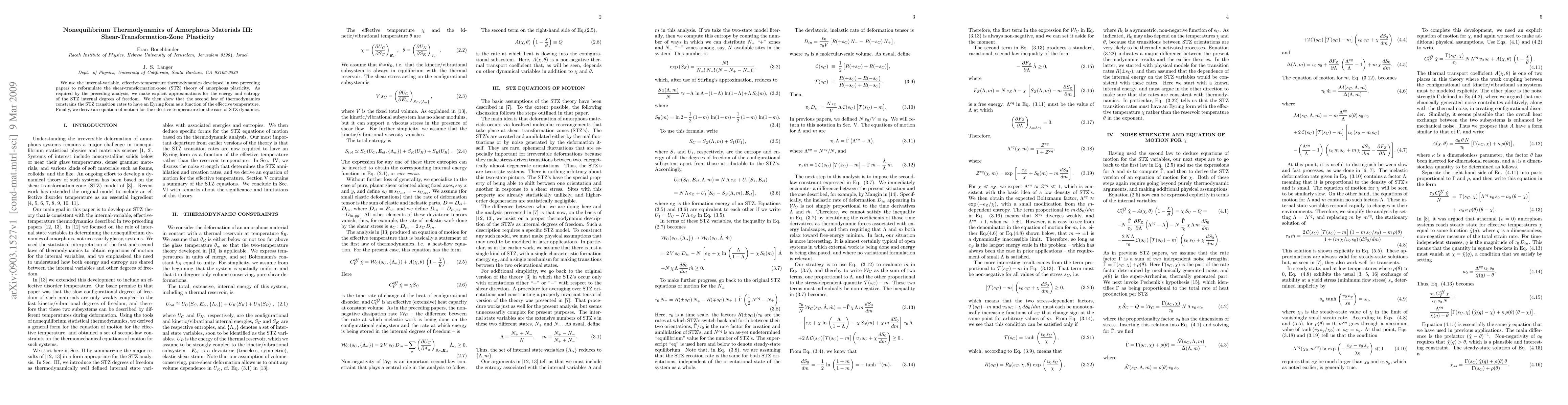 We use the internal-variable, effective-temperature thermodynamics developed in two preceding papers to reformulate the shear-transformation-zone (STZ) theory of amorphous plasticity. As required by the preceding analysis, we make explicit approximations for the energy and entropy of the STZ internal degrees of freedom. We then show that the second law of thermodynamics constrains the STZ transition rates to have an Eyring form as a function of the effective temperature. Finally, we derive an equation of motion for the effective temperature for the case of STZ dynamics.