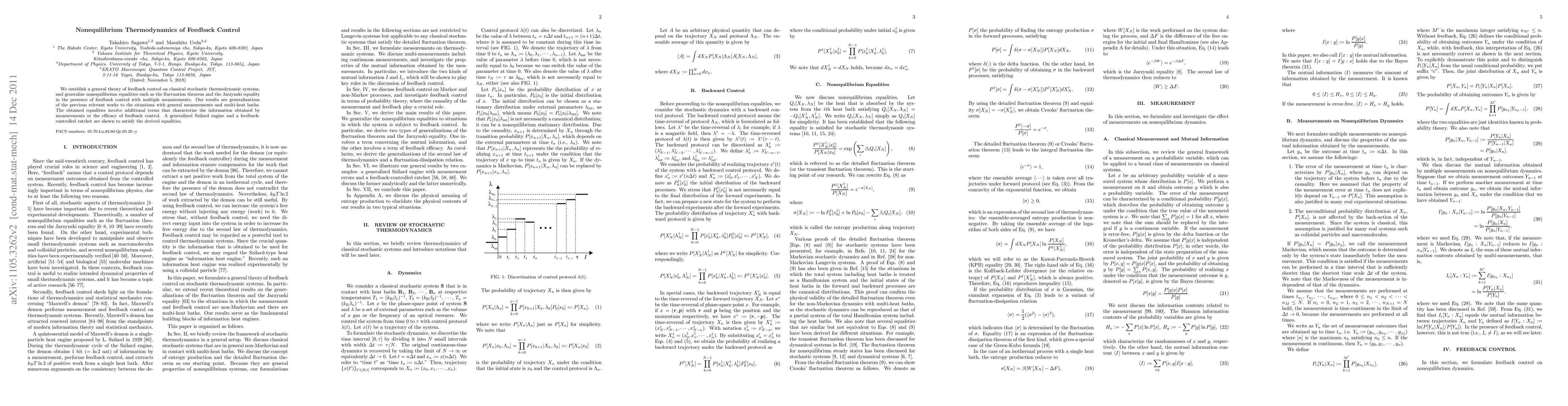 This paper develops a theory for feedback control in stochastic thermodynamic systems, extending nonequilibrium equalities like the fluctuation theorem and Jarzynski equality to scenarios with multiple measurements and multi-heat baths. The results include new terms that reflect measurement information and feedback efficacy, validated through generalized Szilard engines and feedback-controlled ratchets.