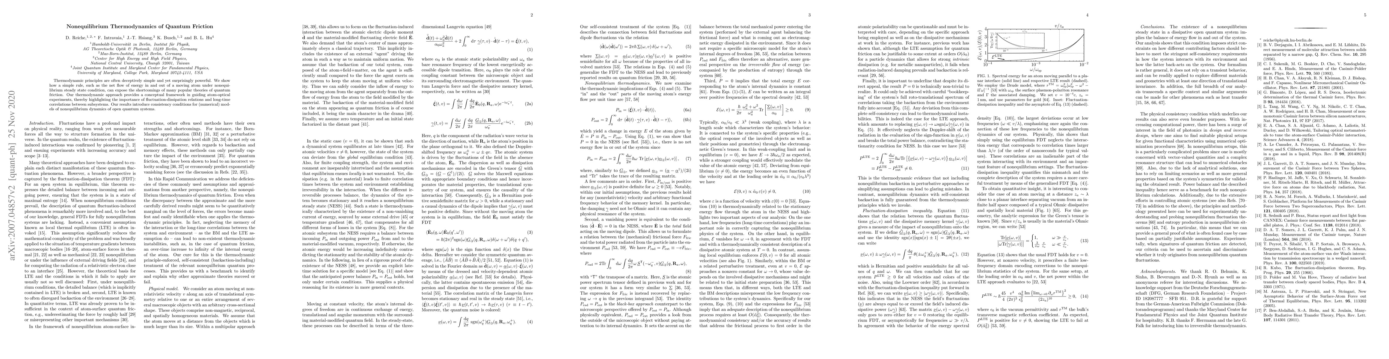 This research reveals that thermodynamic principles, particularly energy flow analysis, expose limitations in quantum friction theories. It emphasizes the significance of fluctuation-dissipation relations and long-term subsystem interactions in guiding atom-optical experiments, establishing consistency conditions for nonequilibrium quantum system models.