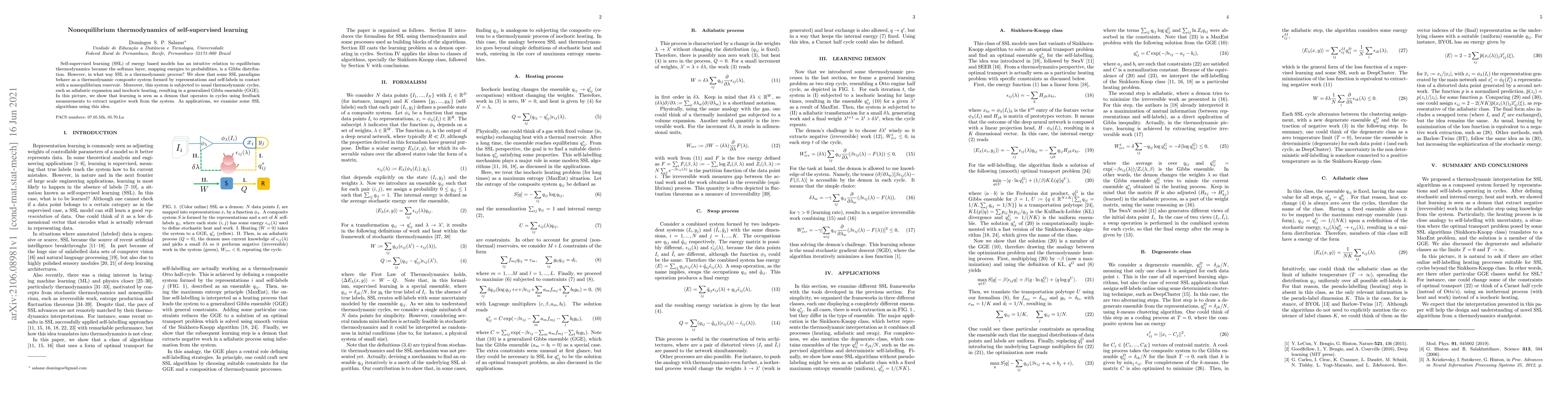 Self-supervised learning (SSL) of energy based models has an intuitive relation to equilibrium thermodynamics because the softmax layer, mapping energies to probabilities, is a Gibbs distribution. However, in what way SSL is a thermodynamic process? We show that some SSL paradigms behave as a thermodynamic composite system formed by representations and self-labels in contact with a nonequilibrium reservoir. Moreover, this system is subjected to usual thermodynamic cycles, such as adiabatic expansion and isochoric heating, resulting in a generalized Gibbs ensemble (GGE). In this picture, we show that learning is seen as a demon that operates in cycles using feedback measurements to extract negative work from the system. As applications, we examine some SSL algorithms using this idea.