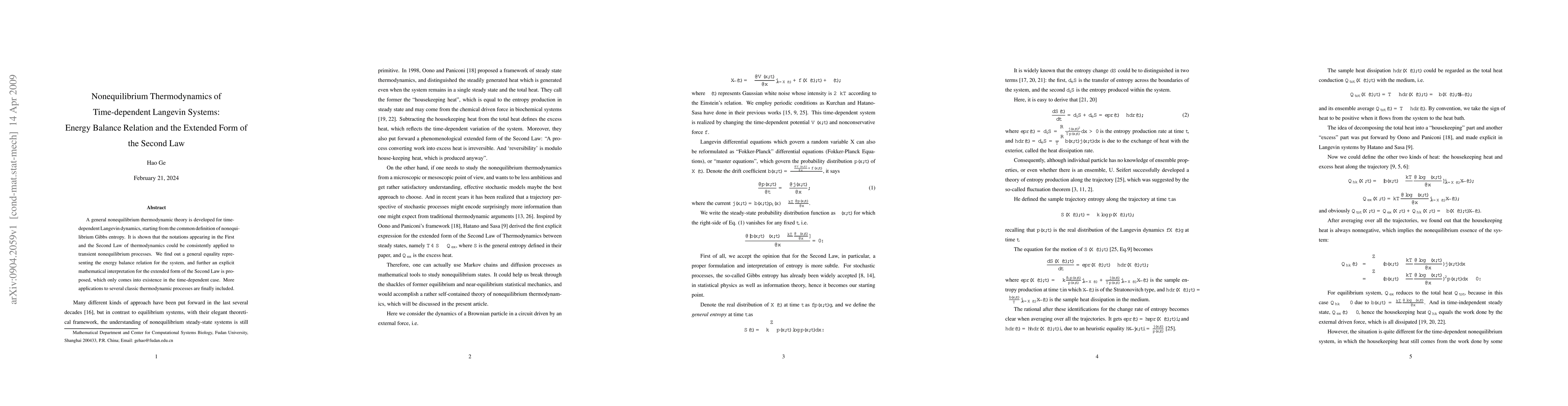 This paper develops a nonequilibrium thermodynamic theory for time-dependent Langevin systems, establishing an energy balance relation and proposing an extended form of the Second Law applicable to transient processes. It provides mathematical interpretations and extends the theory to classic thermodynamic processes.