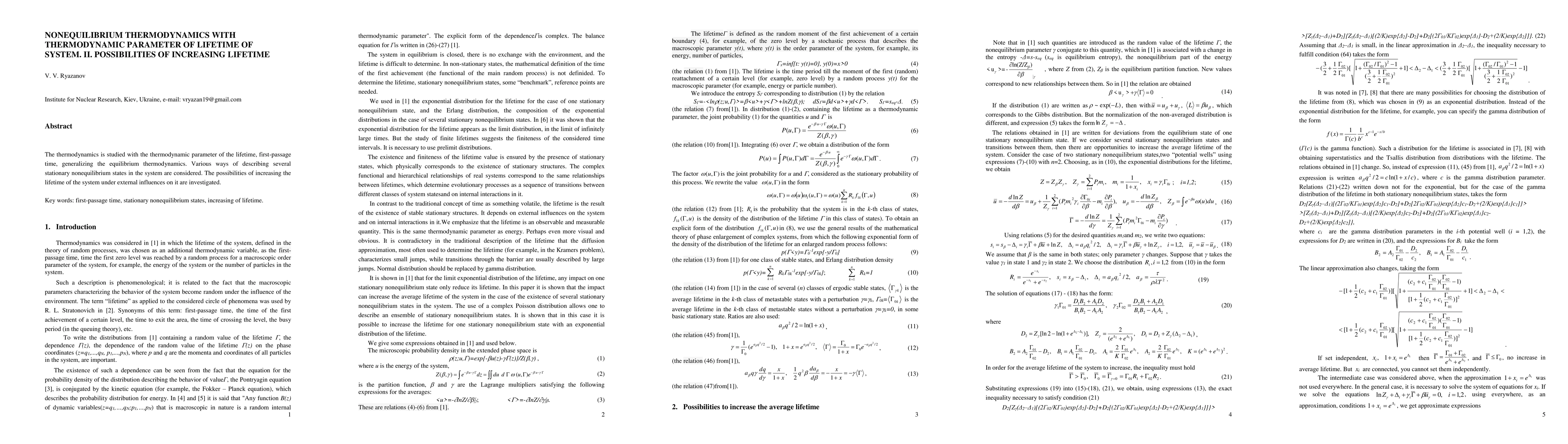 The thermodynamics is studied with the thermodynamic parameter of the lifetime, first-passage time, generalizing the equilibrium thermodynamics. Various ways of describing several stationary nonequilibrium states in the system are considered. The possibilities of increasing the lifetime of the system under external influences on it are investigated.