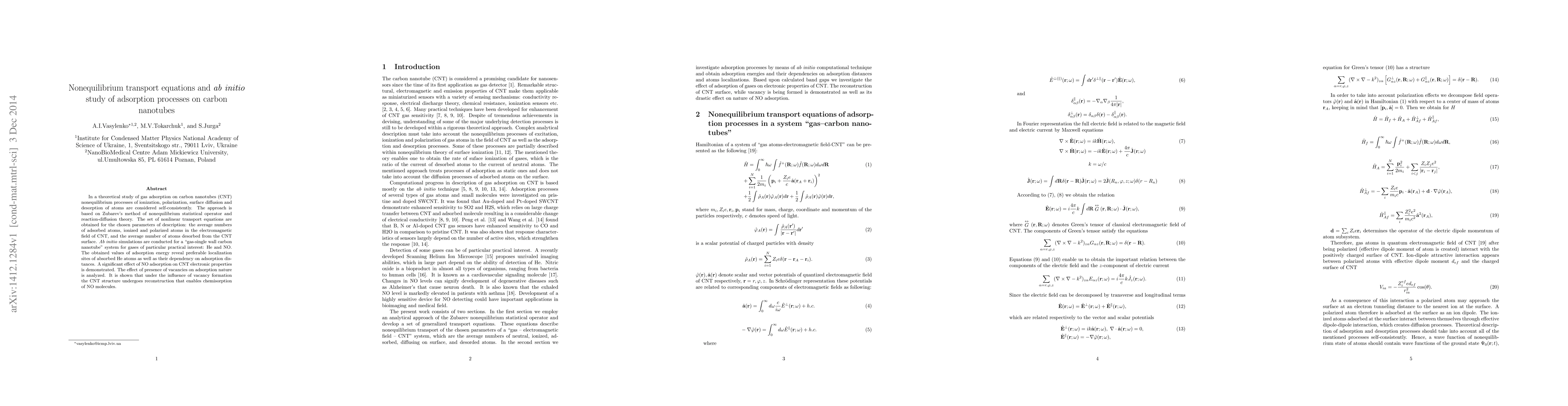 This paper presents a theoretical study using Zubarev's method and reaction-diffusion theory to analyze nonequilibrium adsorption processes on carbon nanotubes, including ionization, polarization, and surface diffusion. Ab initio simulations reveal specific adsorption behaviors for He and NO gases, highlighting the influence of vacancies on CNT structure and electronic properties.