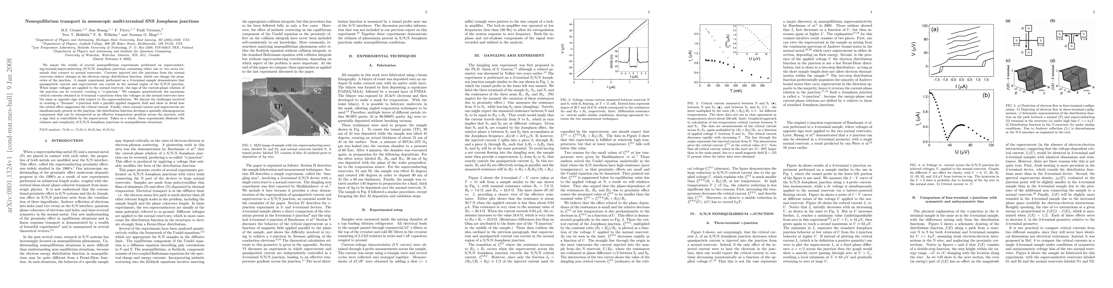 This paper investigates nonequilibrium transport in mesoscopic multi-terminal SNS Josephson junctions, demonstrating that quasiparticle and supercurrents can coexist, and that the current-phase relation can be reversed to create a "$\pi$-junction." It explores the impact of voltage on normal reservoirs and the suppression of critical current by orbital effects, highlighting the spatial inhomogeneity in electron distribution functions.