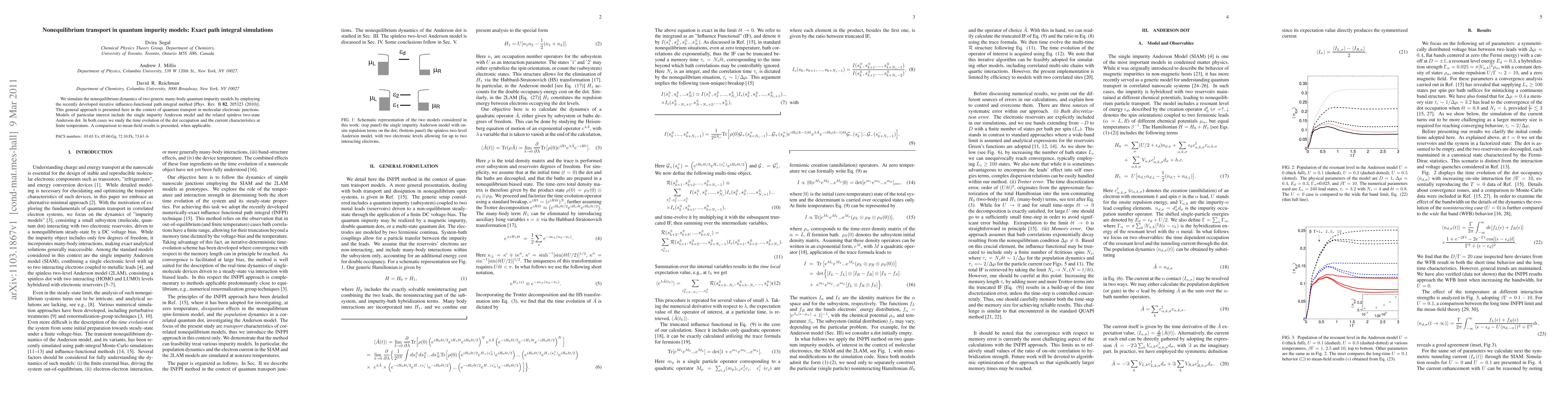 We simulate the nonequilibrium dynamics of two generic many-body quantum impurity models by employing the recently developed iterative influence-functional path integral method [Phys. Rev. B {\bf 82}, 205323 (2010)]. This general approach is presented here in the context of quantum transport in molecular electronic junctions. Models of particular interest include the single impurity Anderson model and the related spinless two-state Anderson dot. In both cases we study the time evolution of the dot occupation and the current characteristics at finite temperature. A comparison to mean-field results is presented, when applicable.