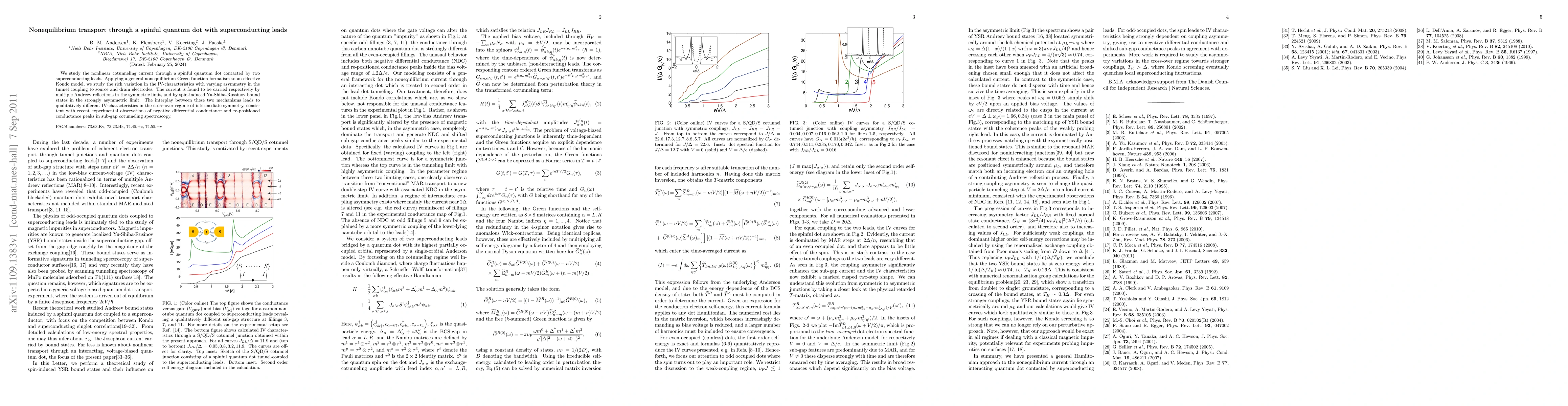 We study the nonlinear cotunneling current through a spinful quantum dot contacted by two superconducting leads. Applying a general nonequilibrium Green function formalism to an effective Kondo model, we study the rich variation in the IV-characteristics with varying asymmetry in the tunnel coupling to source and drain electrodes. The current is found to be carried respectively by multiple Andreev reflections in the symmetric limit, and by spin-induced Yu-Shiba-Russinov bound states in the strongly asymmetric limit. The interplay between these two mechanisms leads to qualitatively different IV-characteristics in the cross-over regime of intermediate symmetry, consistent with recent experimental observations of negative differential conductance and re-positioned conductance peaks in sub-gap cotunneling spectroscopy.