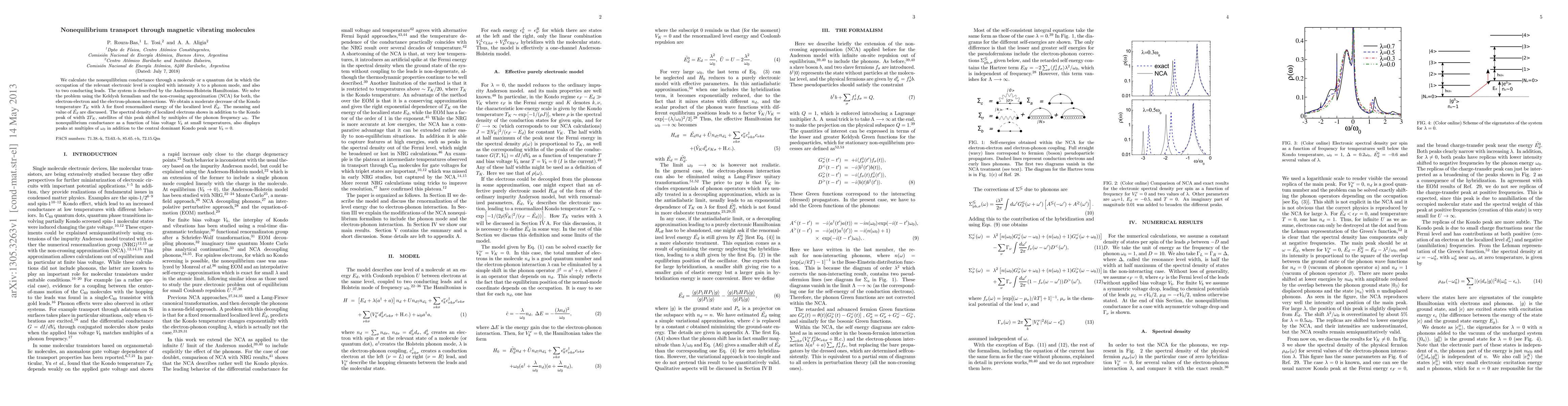 We calculate the nonequilibrium conductance through a molecule or a quantum dot in which the occupation of the relevant electronic level is coupled with intensity $\lambda$ to a phonon mode, and also to two conducting leads. The system is described by the Anderson-Holstein Hamiltonian. We solve the problem using the Keldysh formalism and the non-crossing approximation (NCA) for both, the electron-electron and the electron-phonon interactions. We obtain a moderate decrease of the Kondo temperature $T_K$ with $\lambda$ for fixed renormalized energy of the localized level $\tilde{E_d}$. The meaning and value of $\tilde{E_d}$ are discussed. The spectral density of localized electrons shows in addition to the Kondo peak of width $2 T_K$, satellites of this peak shifted by multiples of the phonon frequency $ \omega_0$. The nonequilibrium conductance as a function of bias voltage $V_b$ at small temperatures, also displays peaks at multiples of $\omega_0$ in addition to the central dominant Kondo peak near $V_b=0$.