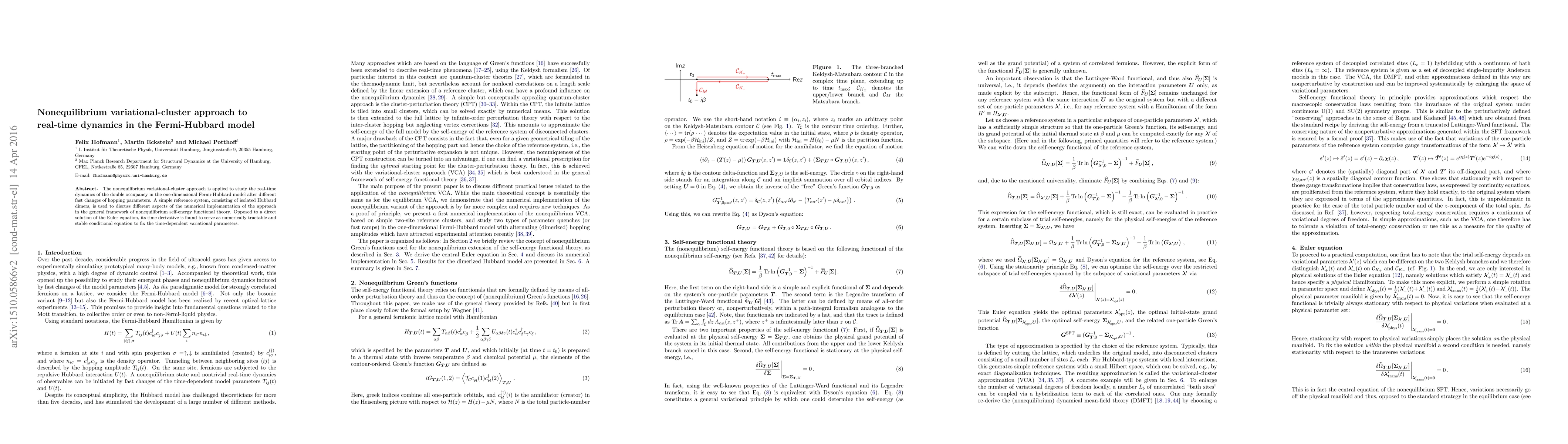 The nonequilibrium variational-cluster approach is utilized to investigate real-time dynamics in the Fermi-Hubbard model following rapid changes in hopping parameters. The time derivative of the Euler equation is found to be a stable and numerically tractable method for determining time-dependent variational parameters.